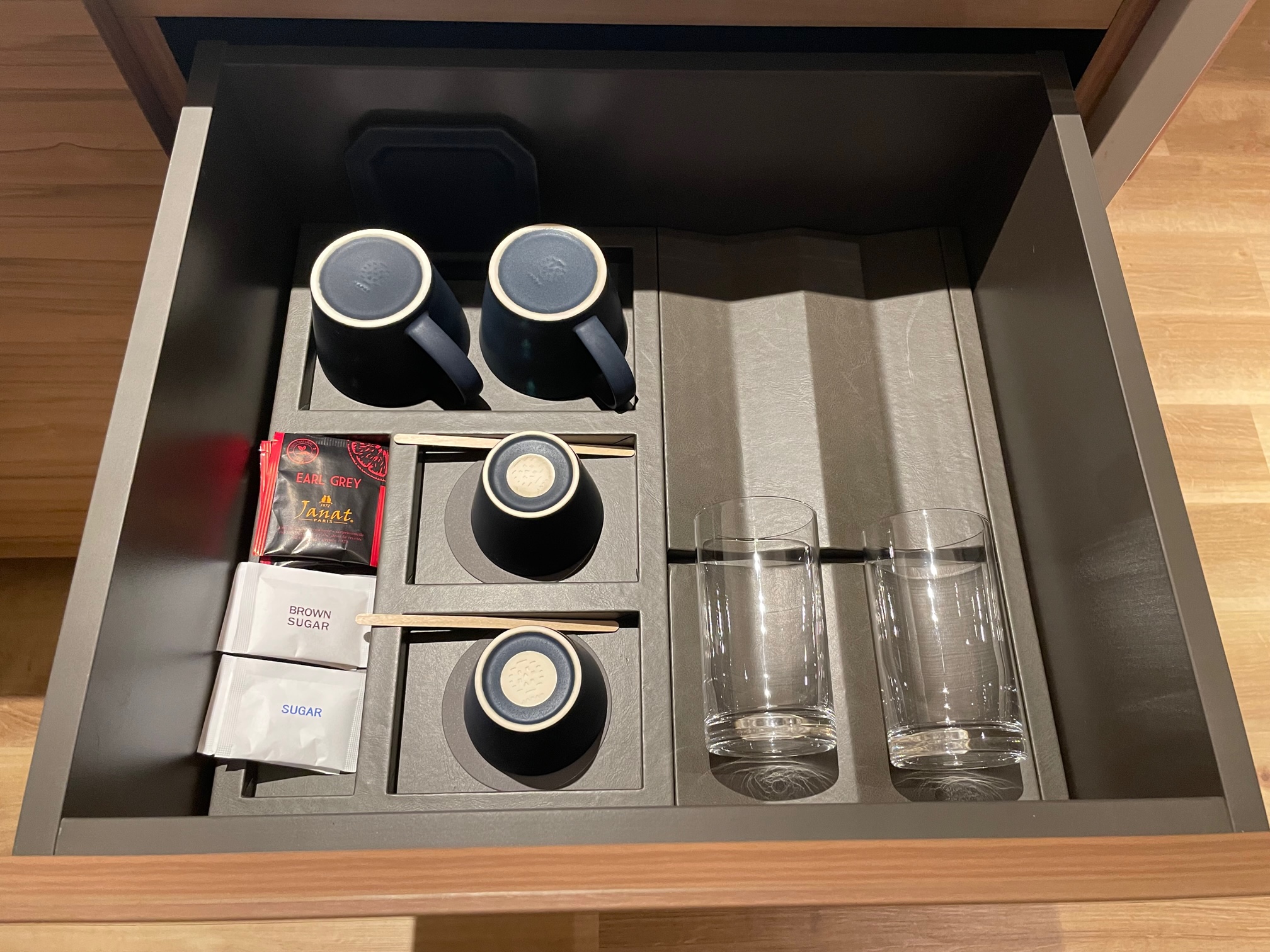 引き出し上段にはマグカップや湯呑み、グラスといった食器と紅茶のティーバッグが入っていました