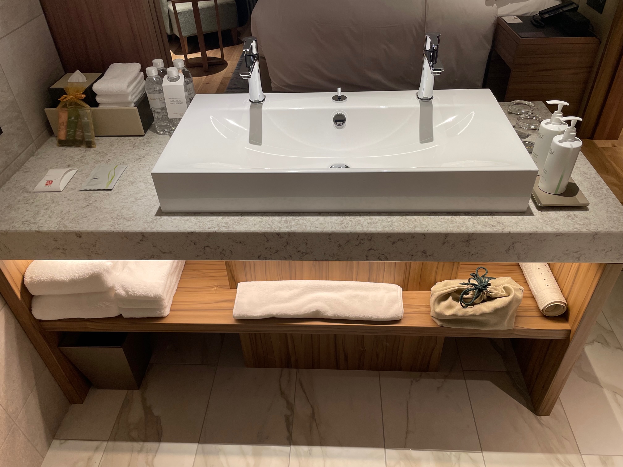 ボウルの反対側には無料のミネラルウォーターやアメニティが置かれています