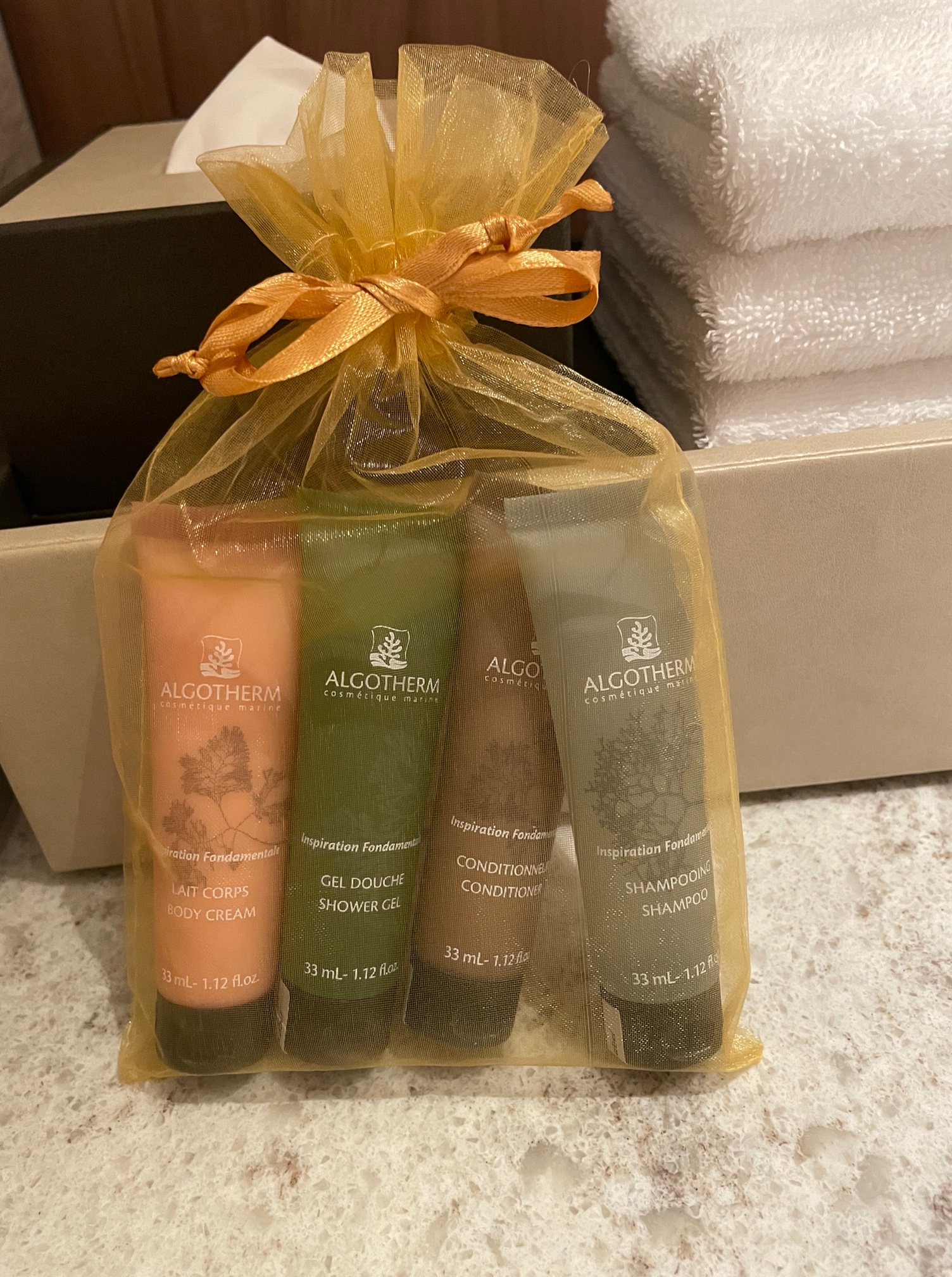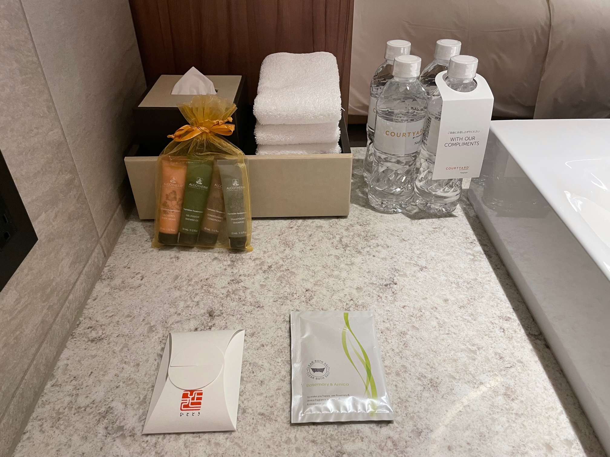 スイートルーム専用のALGOTHERM(アルゴテルム)のアメニティセットが置かれています