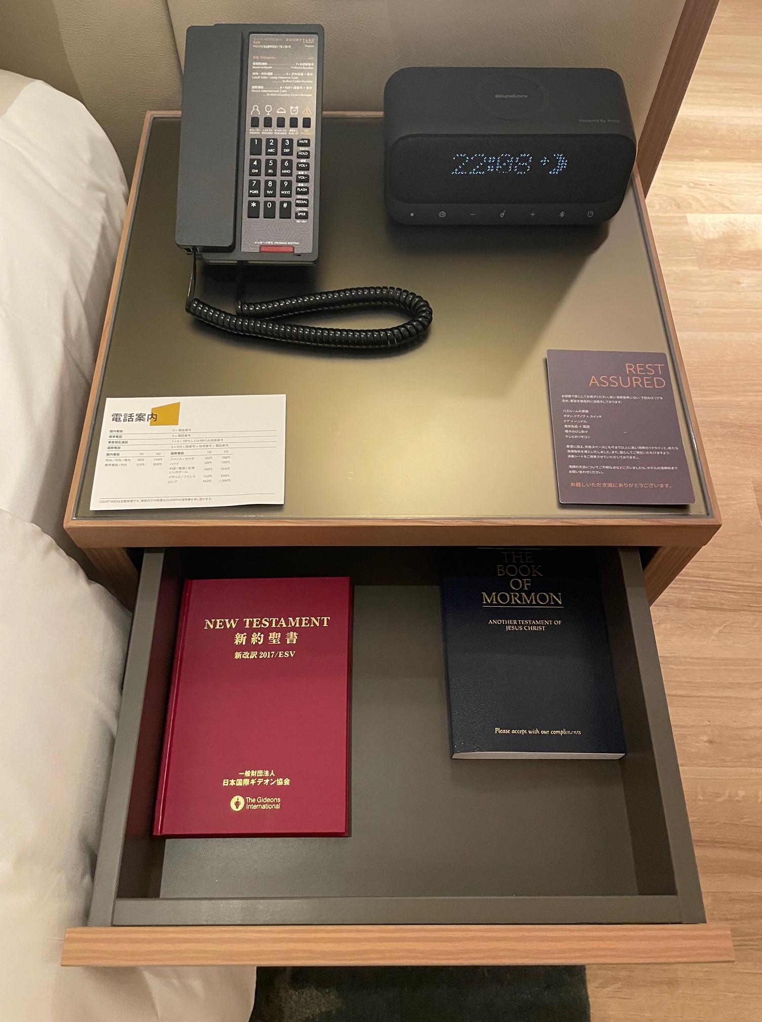 電話にBOSEの時計付きスピーカー、引き出しを開けると聖書