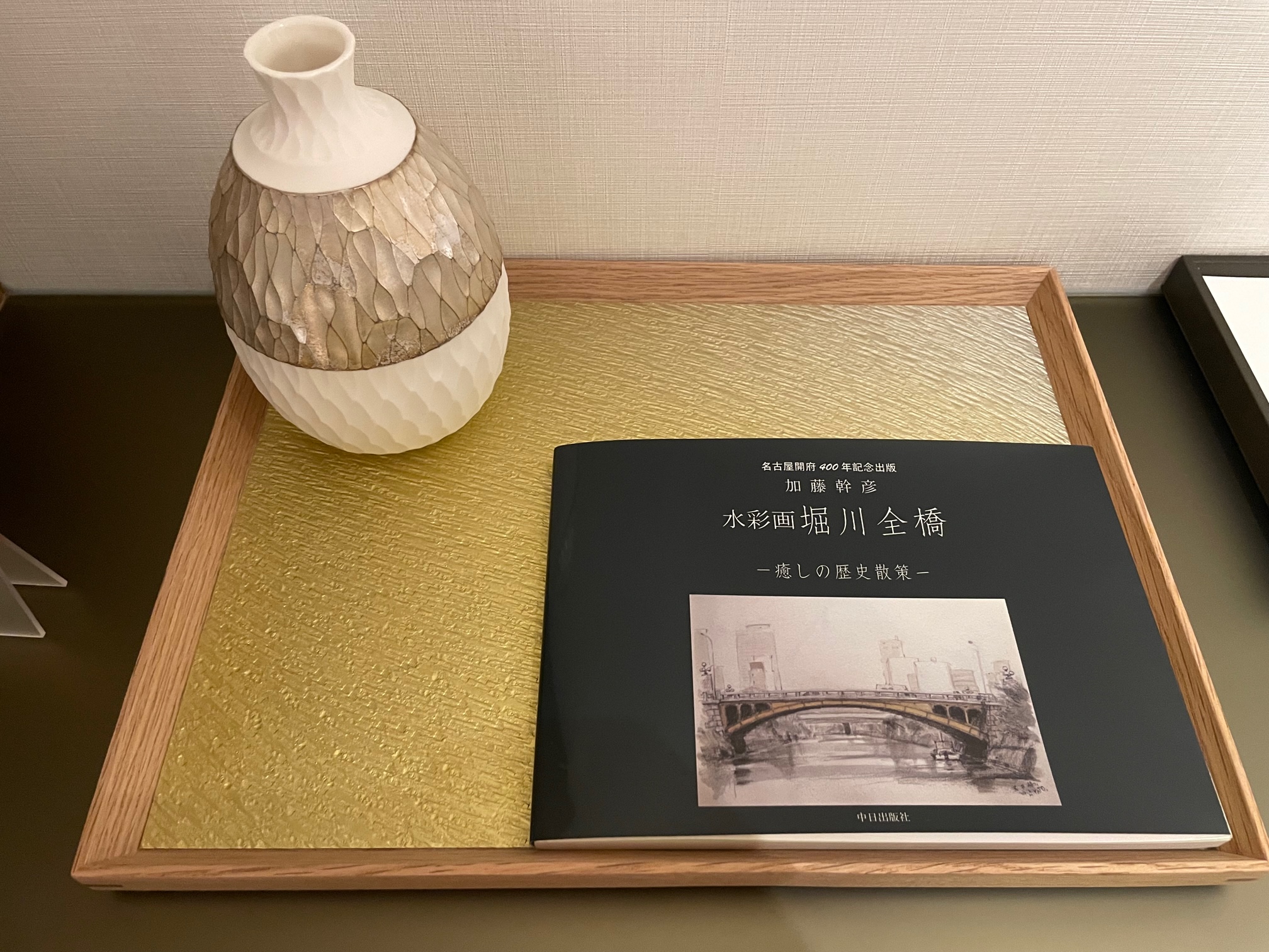 ホテルの案内には「ホテルは名古屋の開発の上で重要な役割を果たした堀川のすぐ隣に位置し、館内のインテリアデザインには堀川の自然・文化・歴史的要素から着想を得ています」と書かれています。