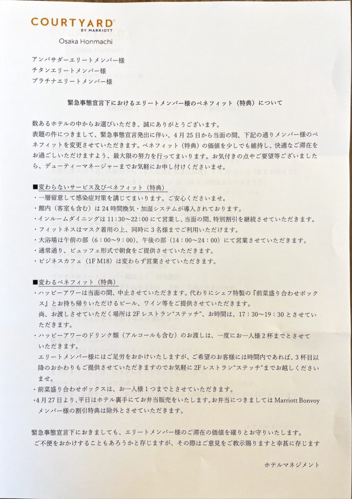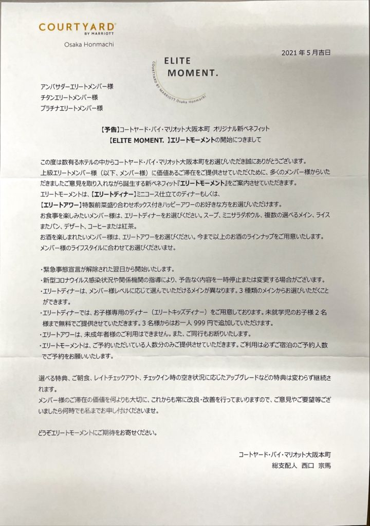 コートヤード・バイ・マリオット大阪本町ではプラチナ会員以上の上級会員に対する新しいベネフィット「エリートモーメント」を緊急事態宣言が解除された翌日から開始するとアナウンスしています。