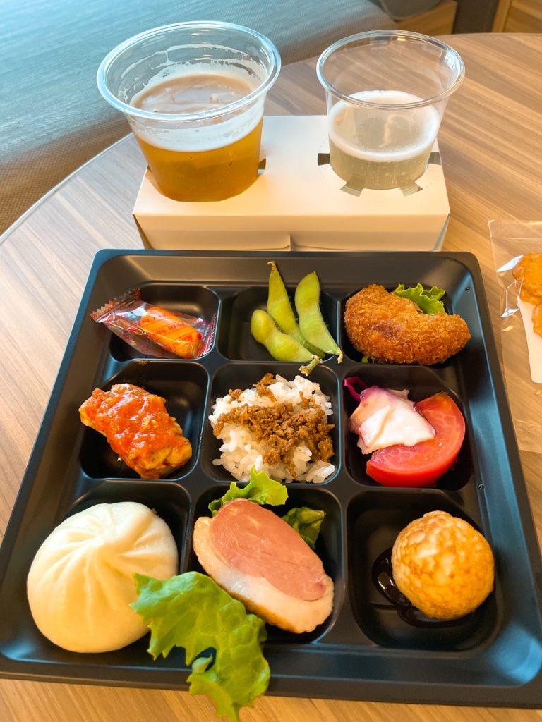 「前菜盛り合わせボックス」は1人あたり1つだけとなっています。アルコールを含むドリンクは2杯の提供となりますが、3杯目以降のお替わりは時間内であればOKです。ただ、2階レストランステッチに逐一取りに行く必要はあります。