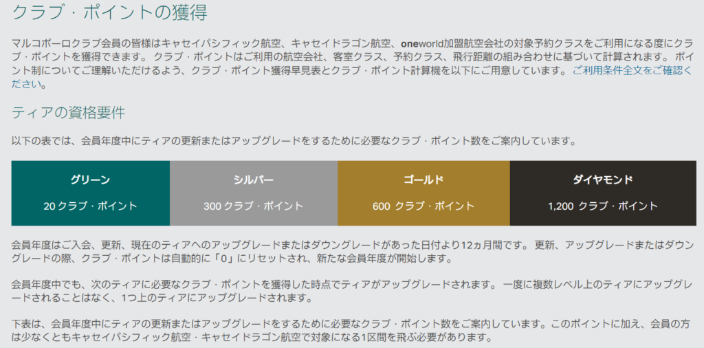 ちなみにキャセイパシフィック航空マルコポーロクラブの上級会員資格を得るために必要なクラブポイントは以下の通りです。