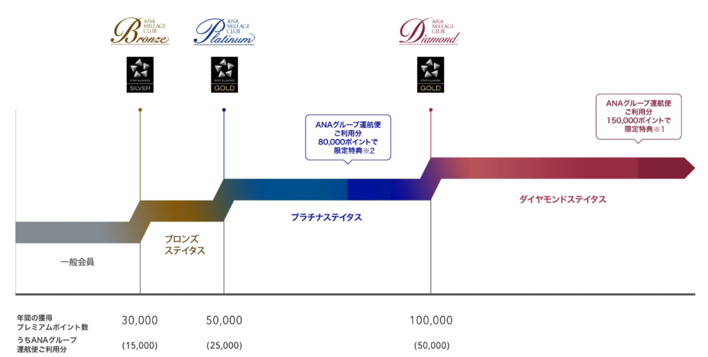 ANAは新型コロナウイルス感染拡大に伴う対応でプレミアムポイント(PP)を2倍にすると発表しています。PPとはANAの上級会員資格を得るのに必要なポイントであり、ANAのステータスを得るのに必要なPPは以下の通りです