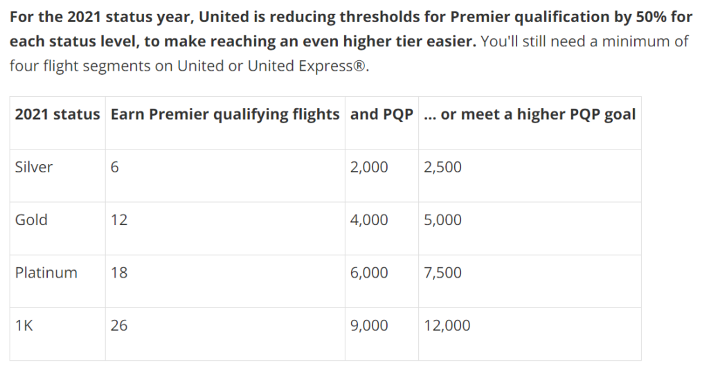 For the 2021 status year, United is reducing thresholds for Premier qualification by 50% for each status level, to make reaching an even higher tier easier.