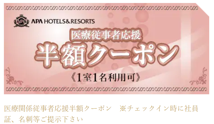 アパホテルは医療従事者が半額で宿泊ができるクーポンを発行しています。医療関係従事者はアパ直(アパホテル公式サイト・アパアプリ)から予約時にクーポンを利用して予約することで、半額の宿泊料金で全国のアパホテルに宿泊できます。チェックイン時にIDや名刺など医療従事者であることが証明できるものを提示する必要があります。