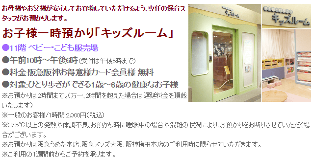お得意様カードプレミアムを持っている方は阪急うめだ本店利用時だけでなく、阪急メンズ大阪・阪神梅田本店を利用する際にも利用可能で、1人歩きができる1歳~6歳の子供を最大2時間まで無料で預けることができます。