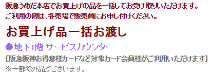 ペルソナカードなど他のカード会員にも適用されるサービスですが、お買い上げ品一括お渡しサービスもあり、阪急うめだ本店地下1階サービスカウンターで一括して受け取ることができます。