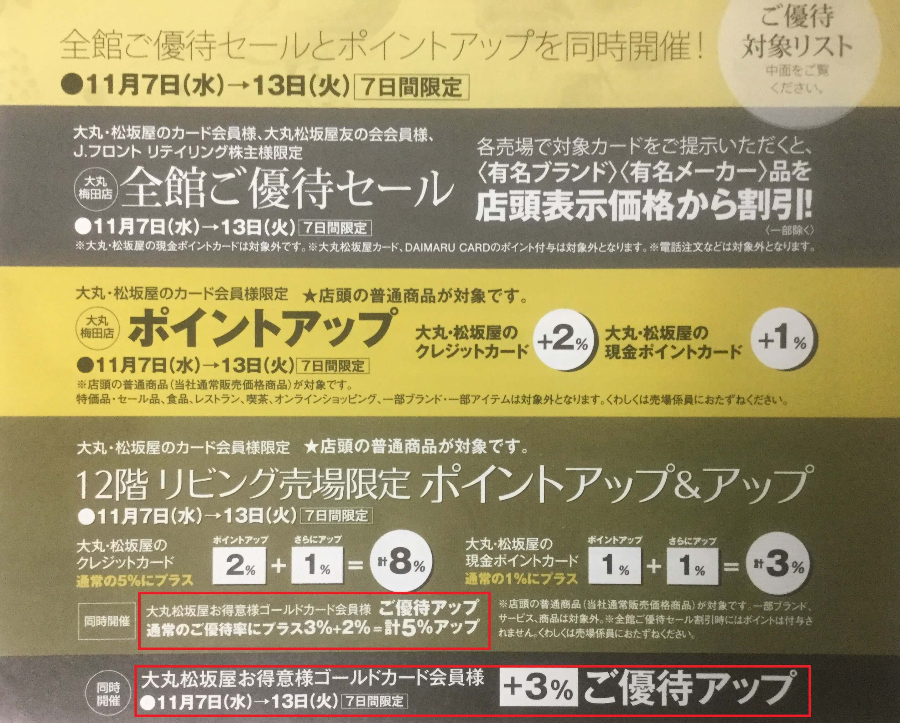 大丸松坂屋お得意様ゴールドカード会員限定で、しばしば3%優待アップデーが開催されています。この期間中は上述の5-10%の優待率が3%アップし、8-13%の優待率となります。