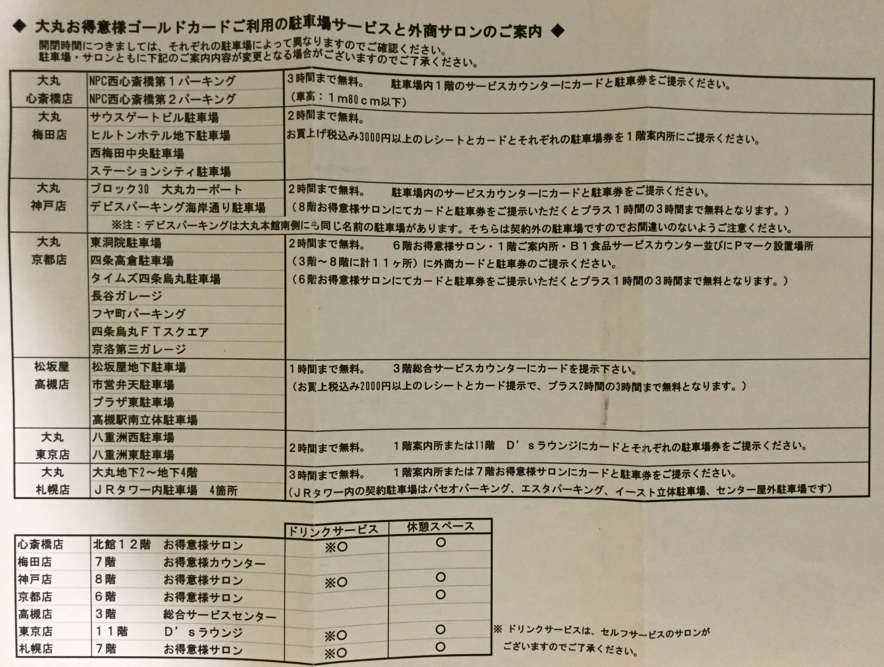 どの駐車場が優待割引かなど駐車場サービスや外商サロンの詳細につきましては以下の画像をご覧ください(関西の顧客向けなので全国を網羅しているわけではないかもしれません)。例えば大丸東京店では八重洲西駐車場、八重洲東駐車場が、大丸梅田店はサウスゲートビル駐車場、ヒルトンホテル地下駐車場、西梅田中央駐車場、ステーションシティ駐車場が割引対象となります。