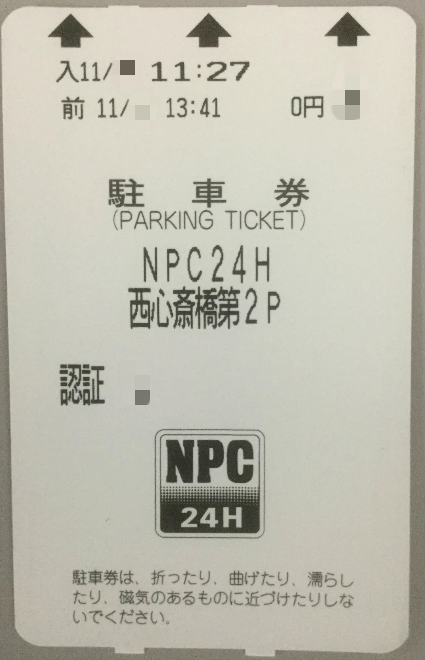 例えば大丸心斎橋店提携のNPC西心斎橋第2パーキングはホテル日航大阪の横にあり大丸心斎橋店までは徒歩数分ととても便利な場所にあります。以前はそごうの駐車場でした。下の画像のように2時間以上駐車していますが0円となっています。レシートを見せる必要はなく大丸で買い物しなくてもこのサービスは受けることができます。