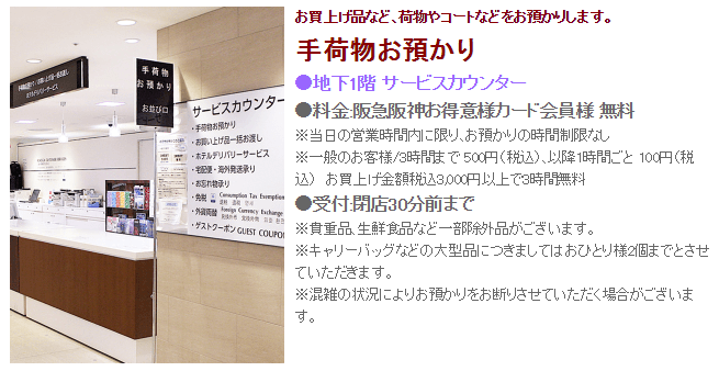 阪急うめだ本店地下1階のサービスカウンターで手荷物を預けることができます(受付は閉店30分前まで)。