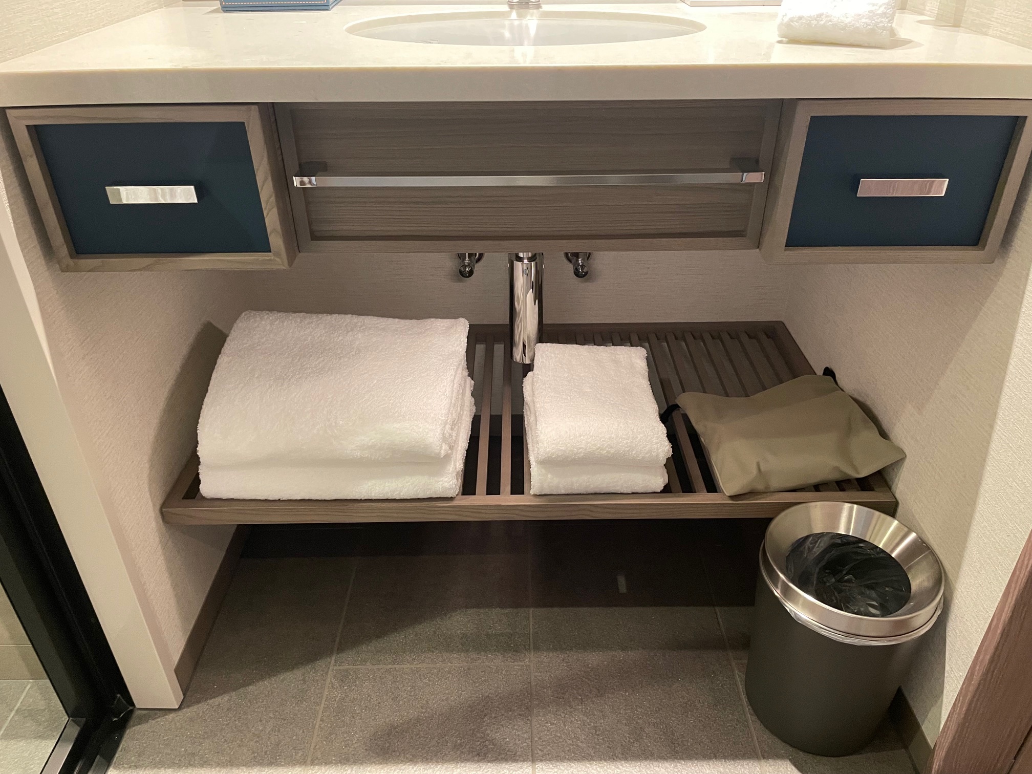 洗面ボウルの下にはバスタオル、タオル、ドライヤー、ゴミ箱が置かれています