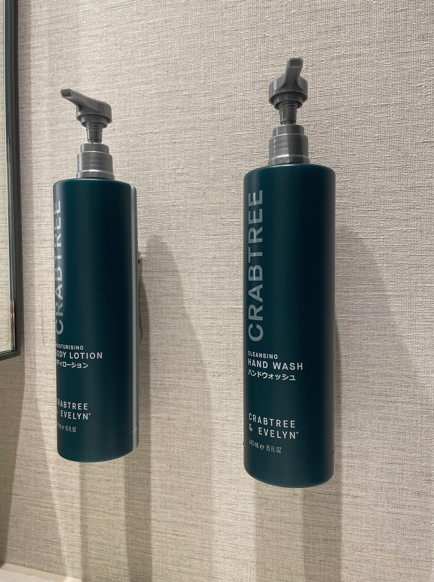 壁にはCrabtree & Evelyn (クラブツリー&イヴリン)のアメニティがボトルで据え付けられています