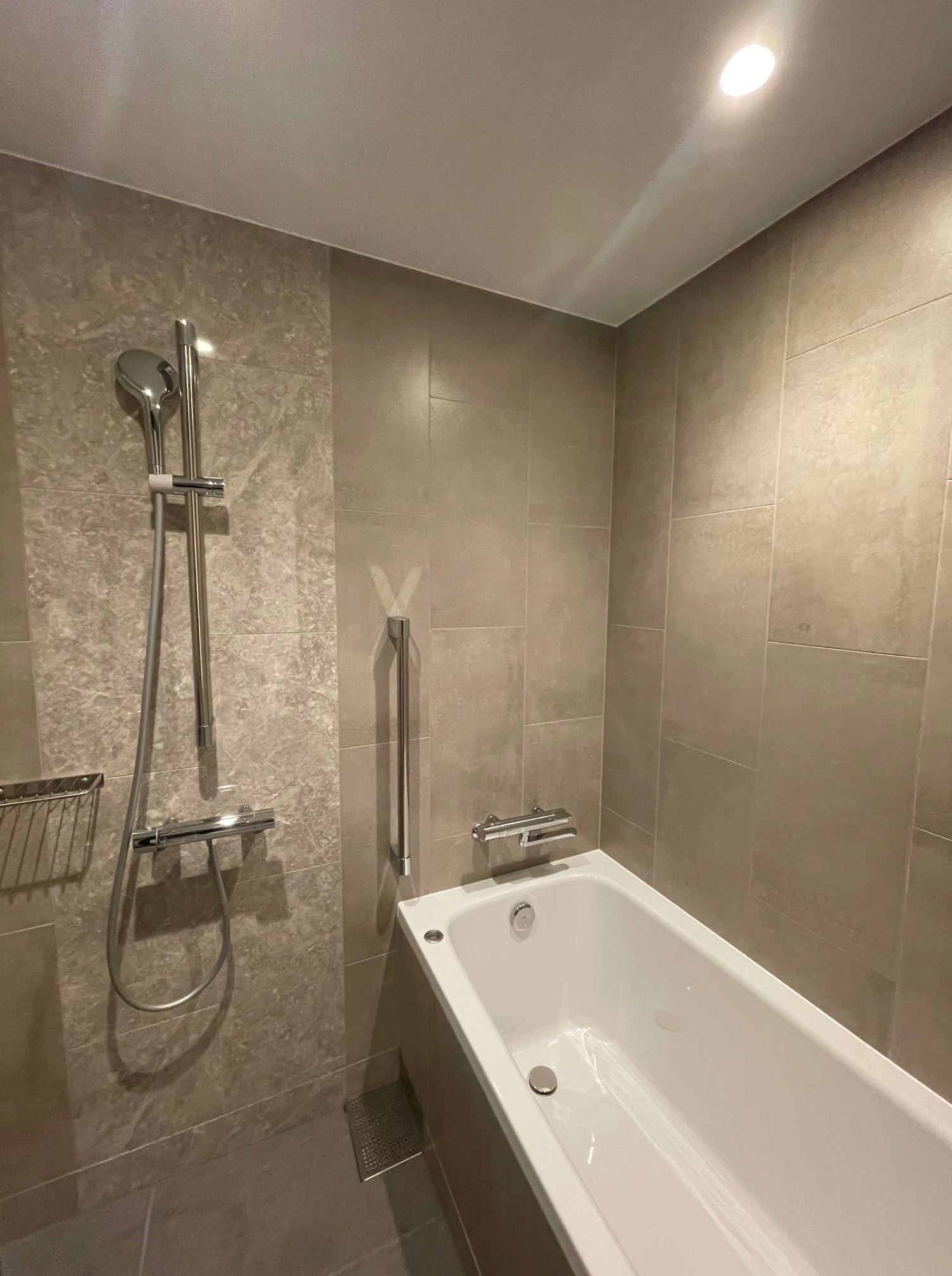 壁にはCrabtree & Evelyn (クラブツリー&イヴリン)のシャンプー、コンディショナーなどのボトルが据え付けられています