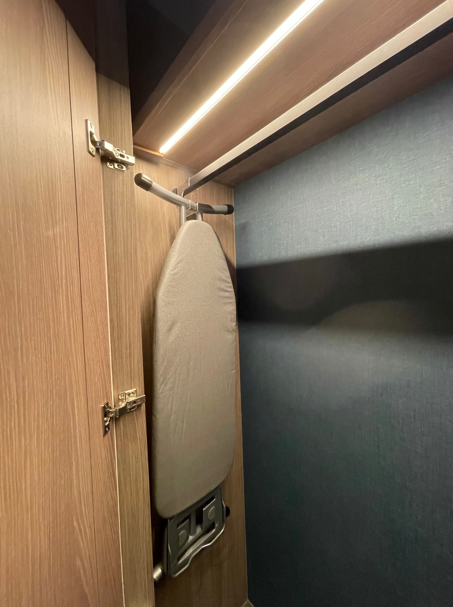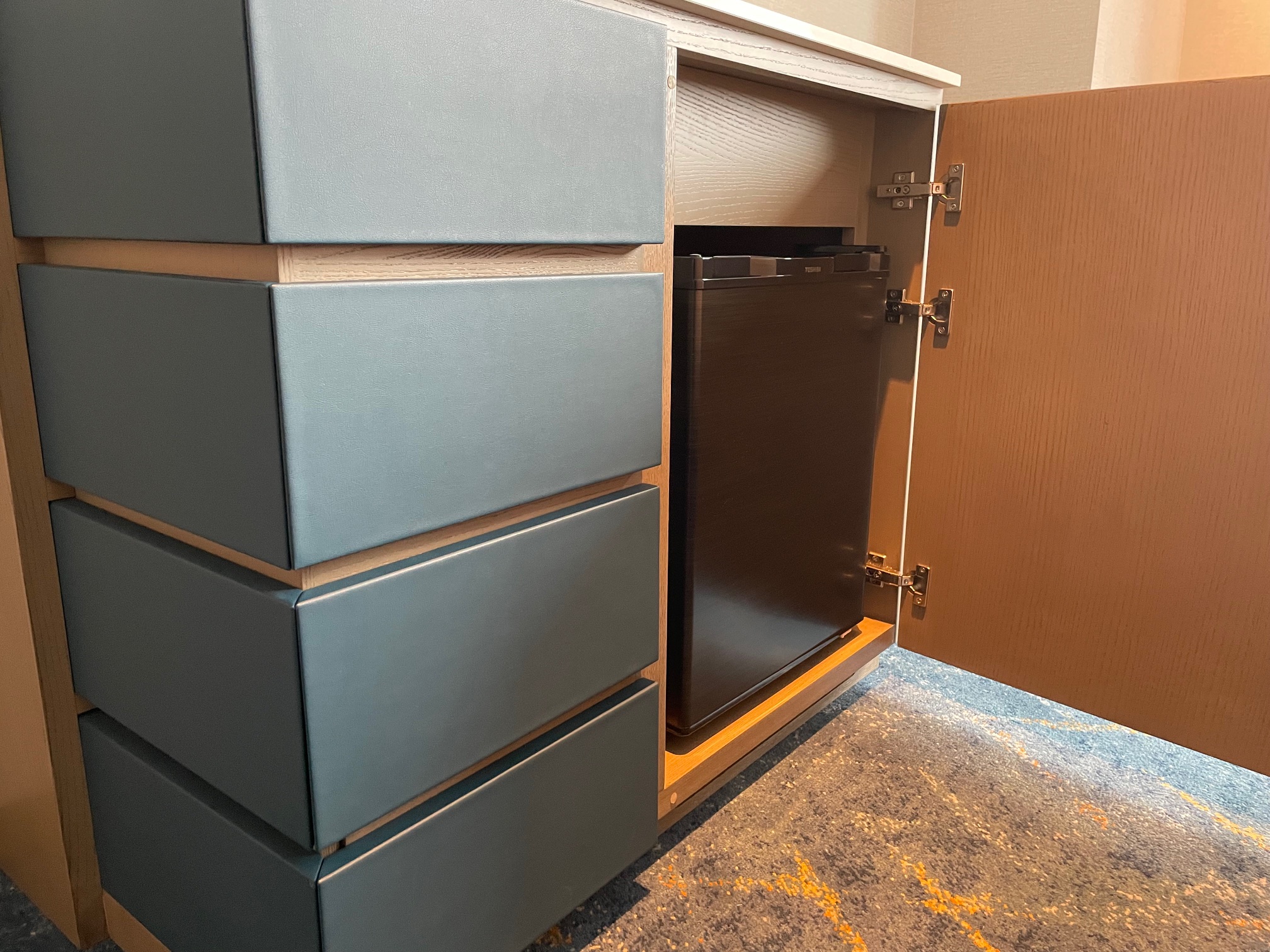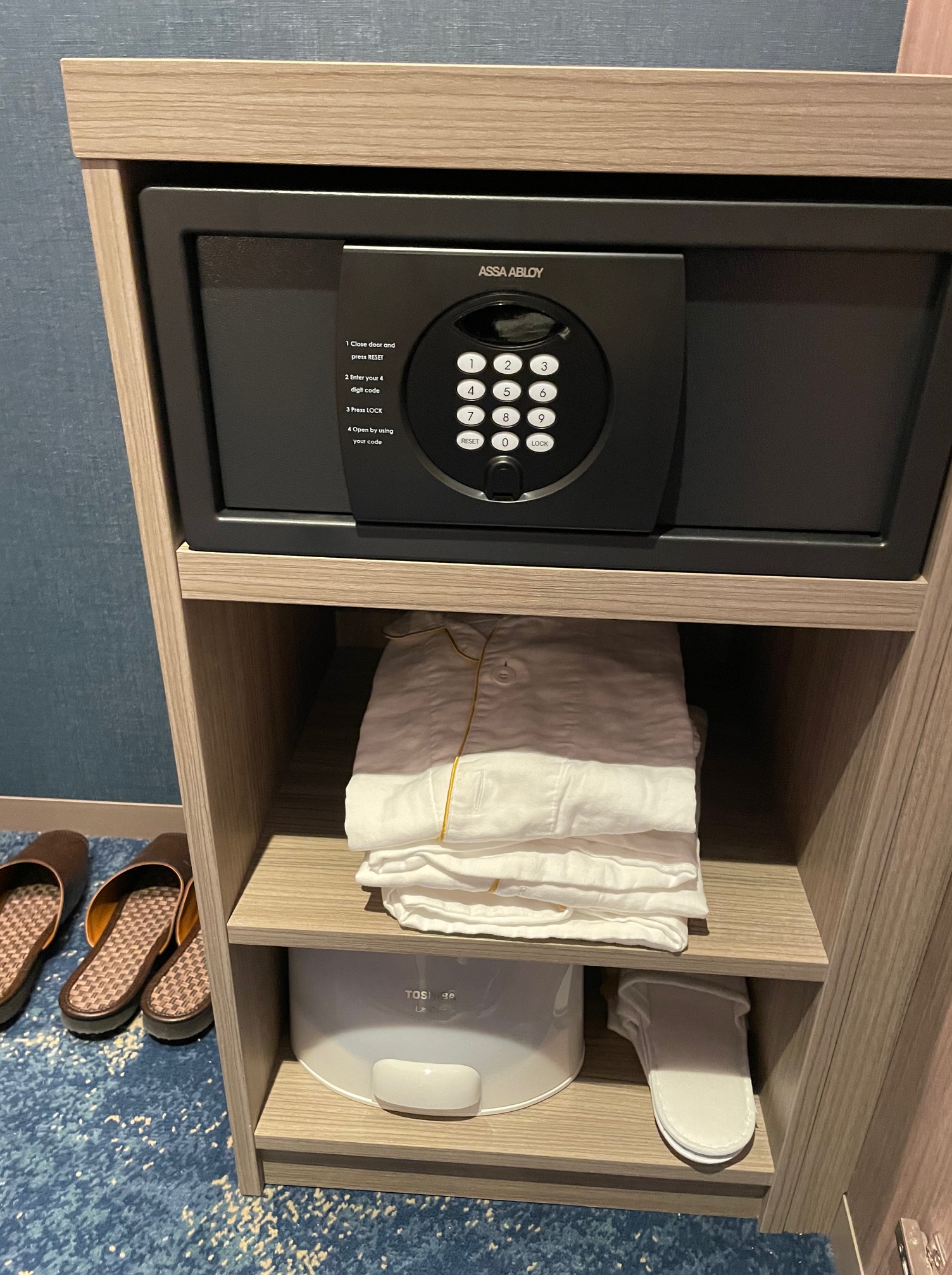 中のキャビネットの上段はセーフティーボックス、中段にはセパレートタイプのパジャマ、下段にはアイロンと使い捨てスリッパ