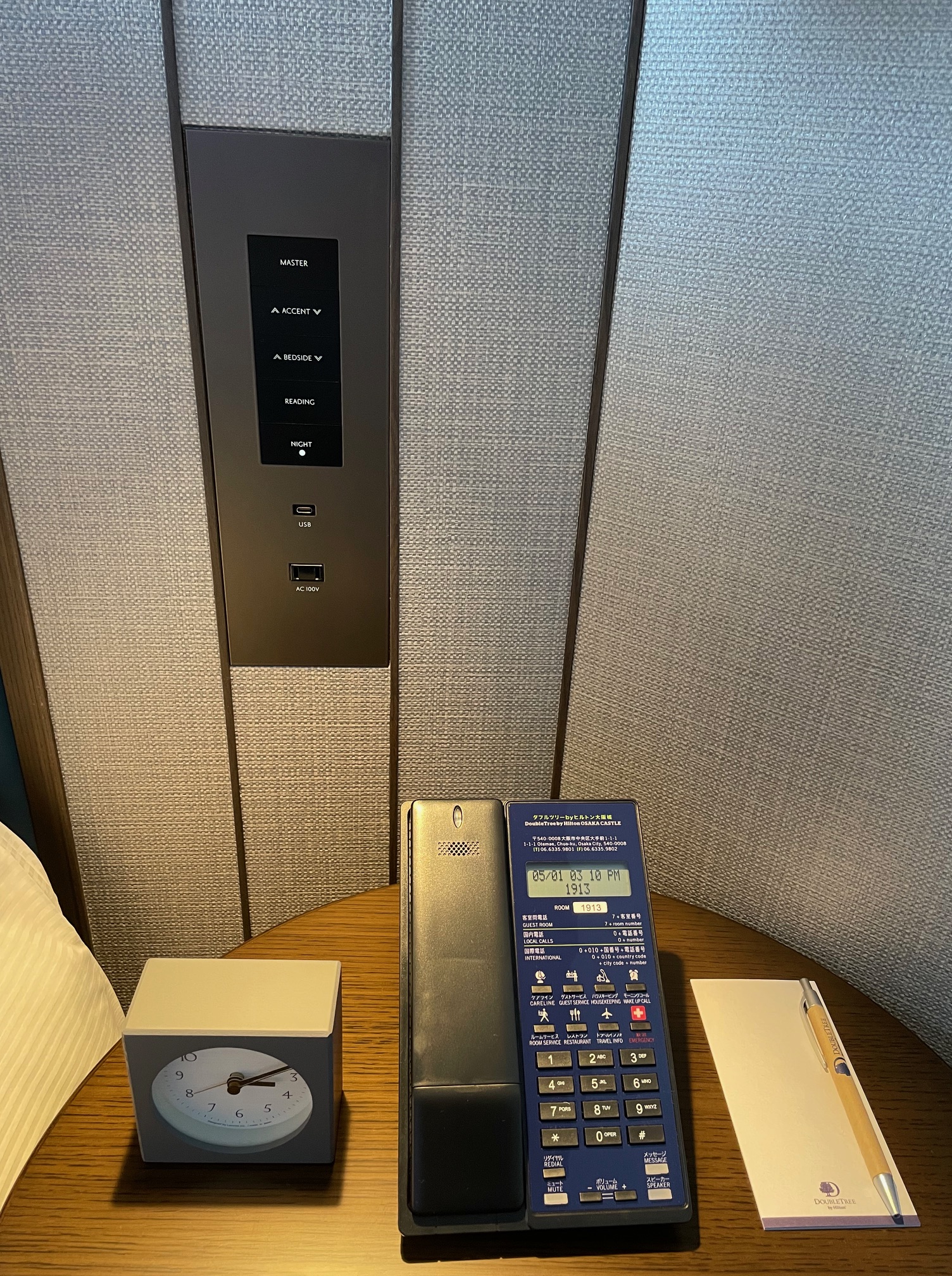 ベッドサイド右側のナイトテーブル上には時計、電話、メモ帳とペン