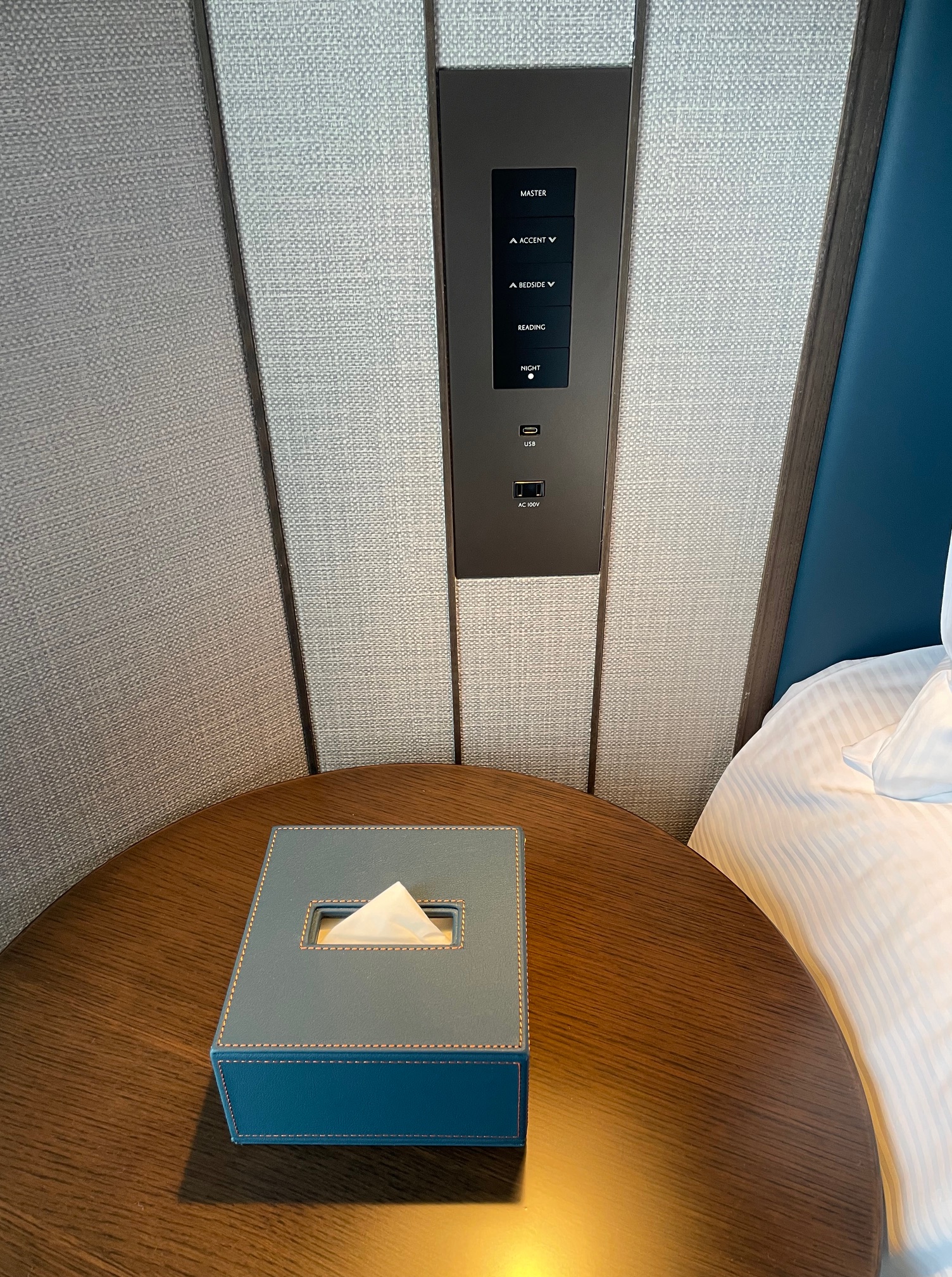 ベッドサイド左側のナイトテーブルにはティッシュ