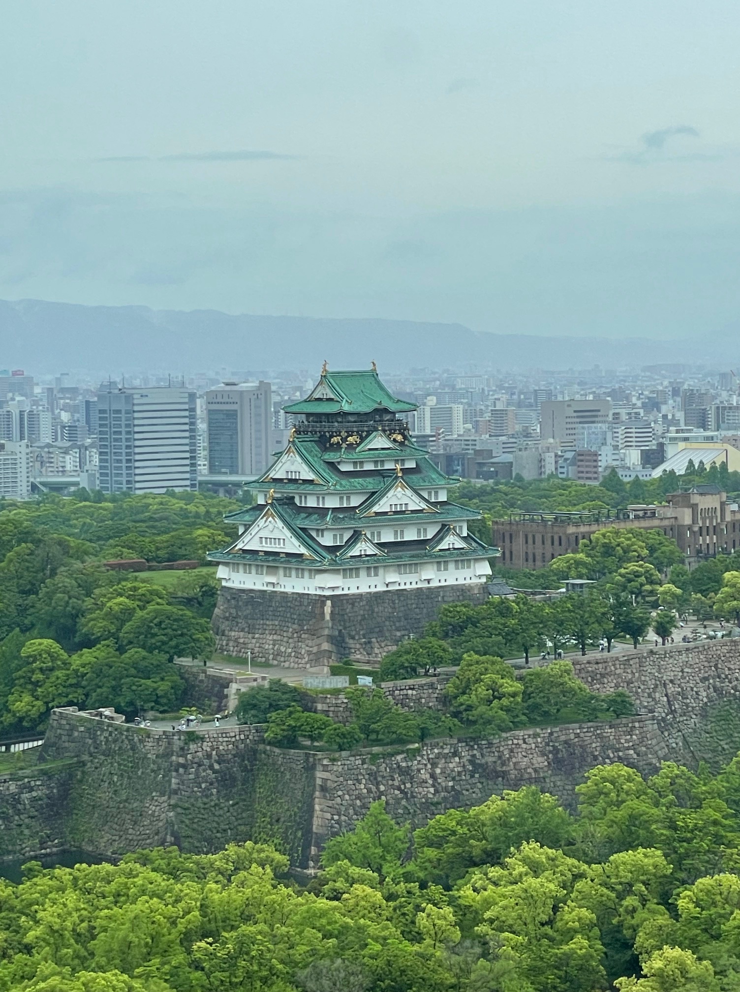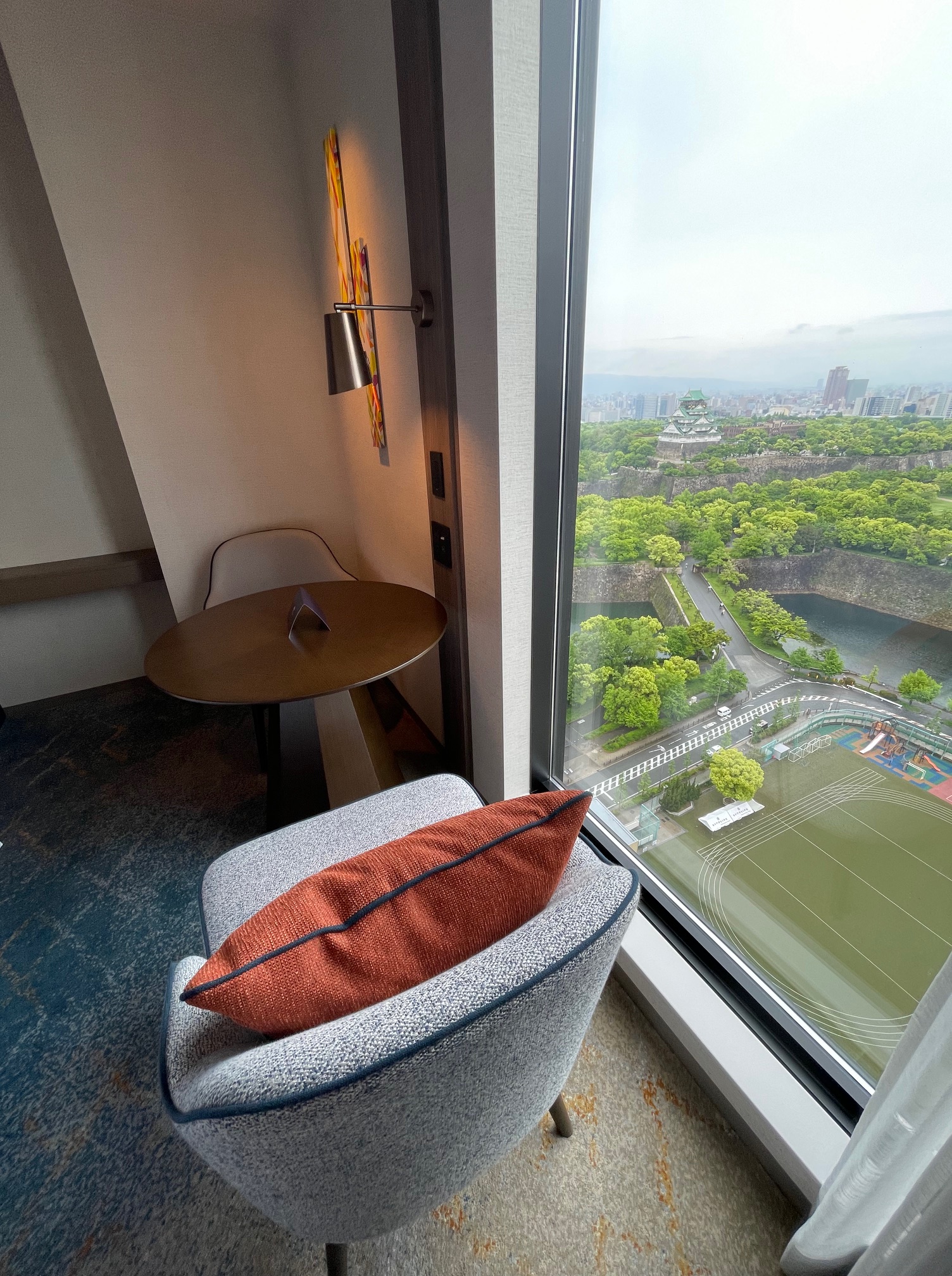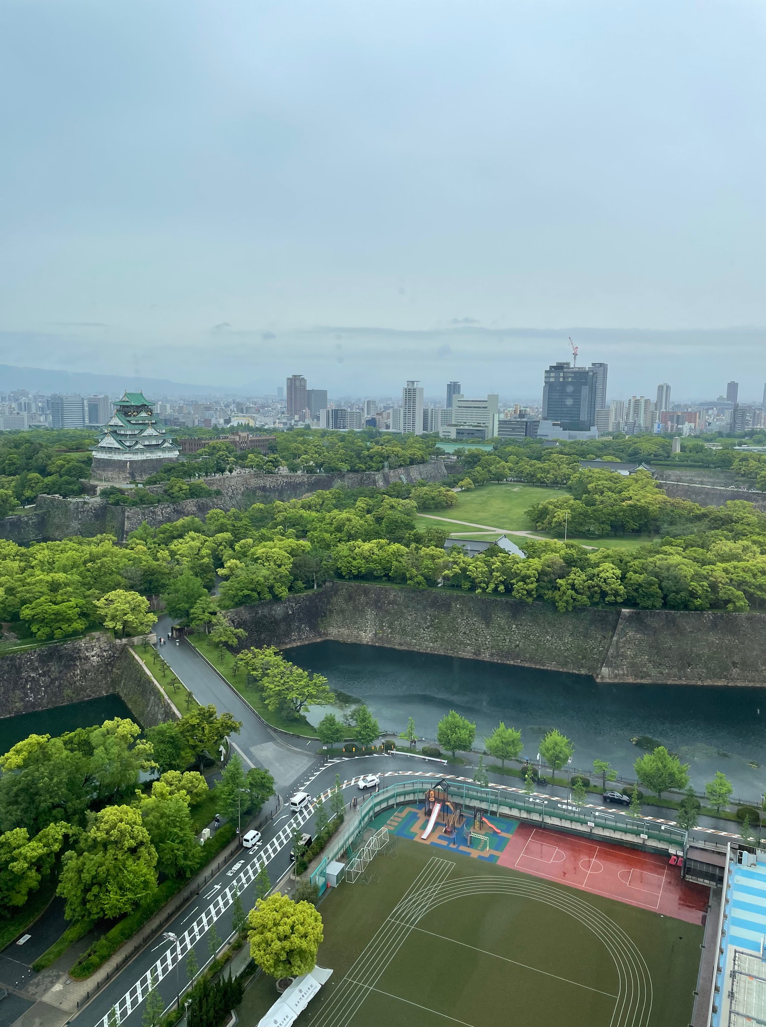 窓からの景色は大阪城で、位置的には西の丸庭園が良く見えますし、追手門学院小学校&中高が良く見えます(笑)