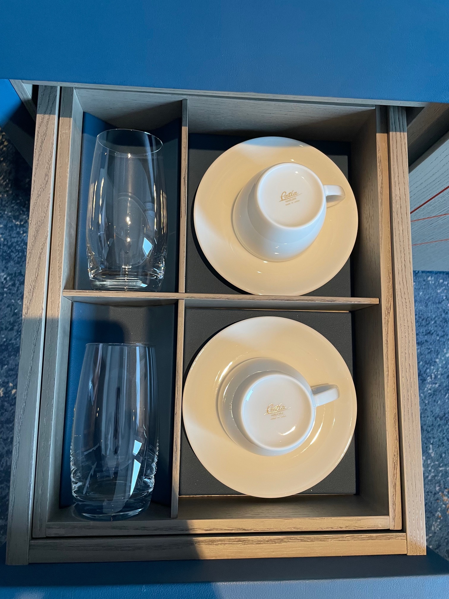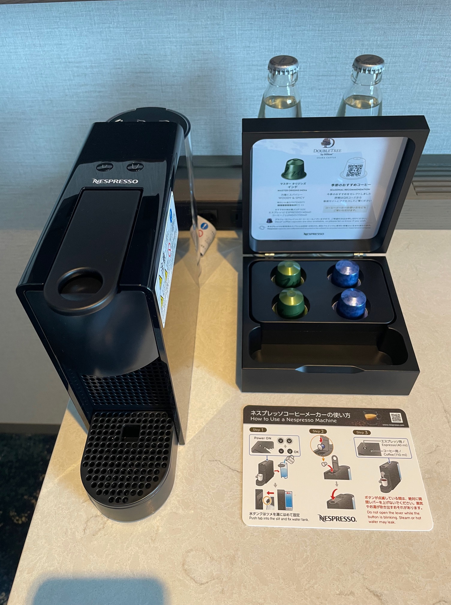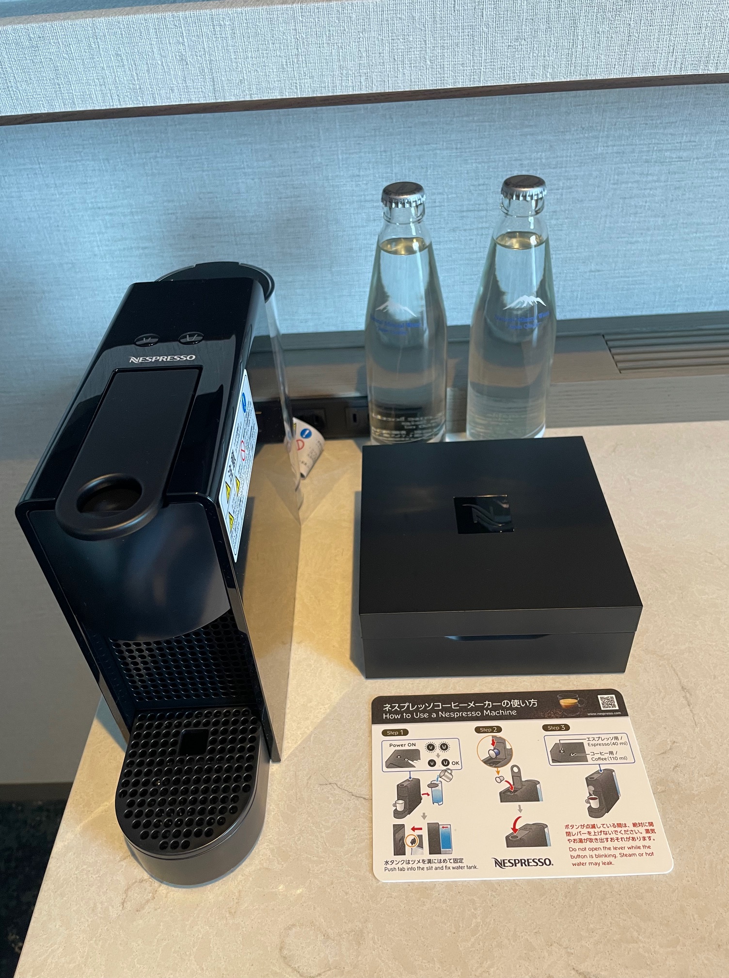 キャビネット上にはガラスボトルのミネラルウォーター2本、ネスプレッソ