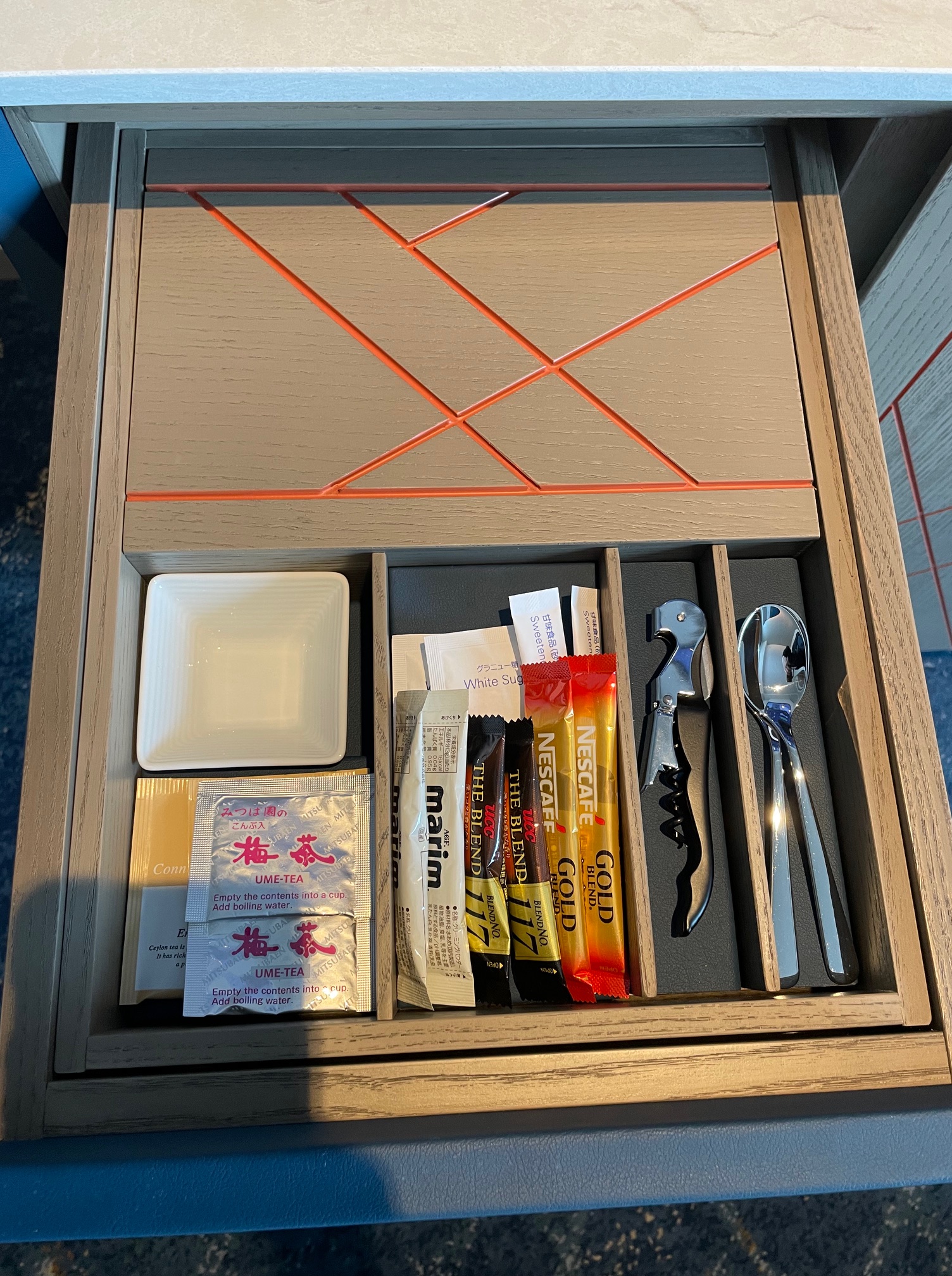 上の段はスプーン、栓抜き、インスタントコーヒー、梅茶、紅茶など
