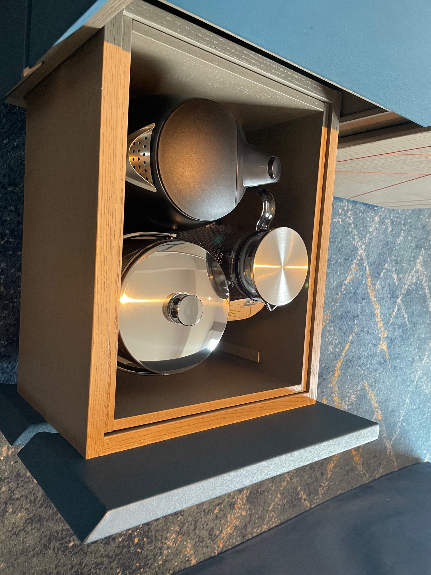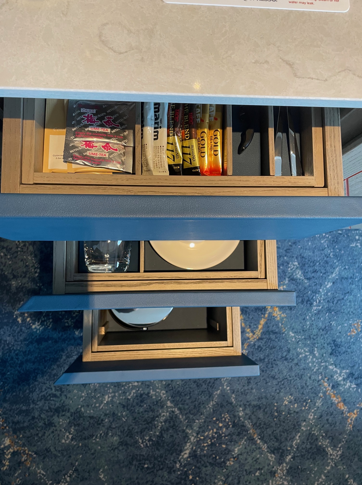 下段は前述の通り深くなっておりプラスチック製のカラフェ?ピッチャー?、アイスペール、電気ケトル