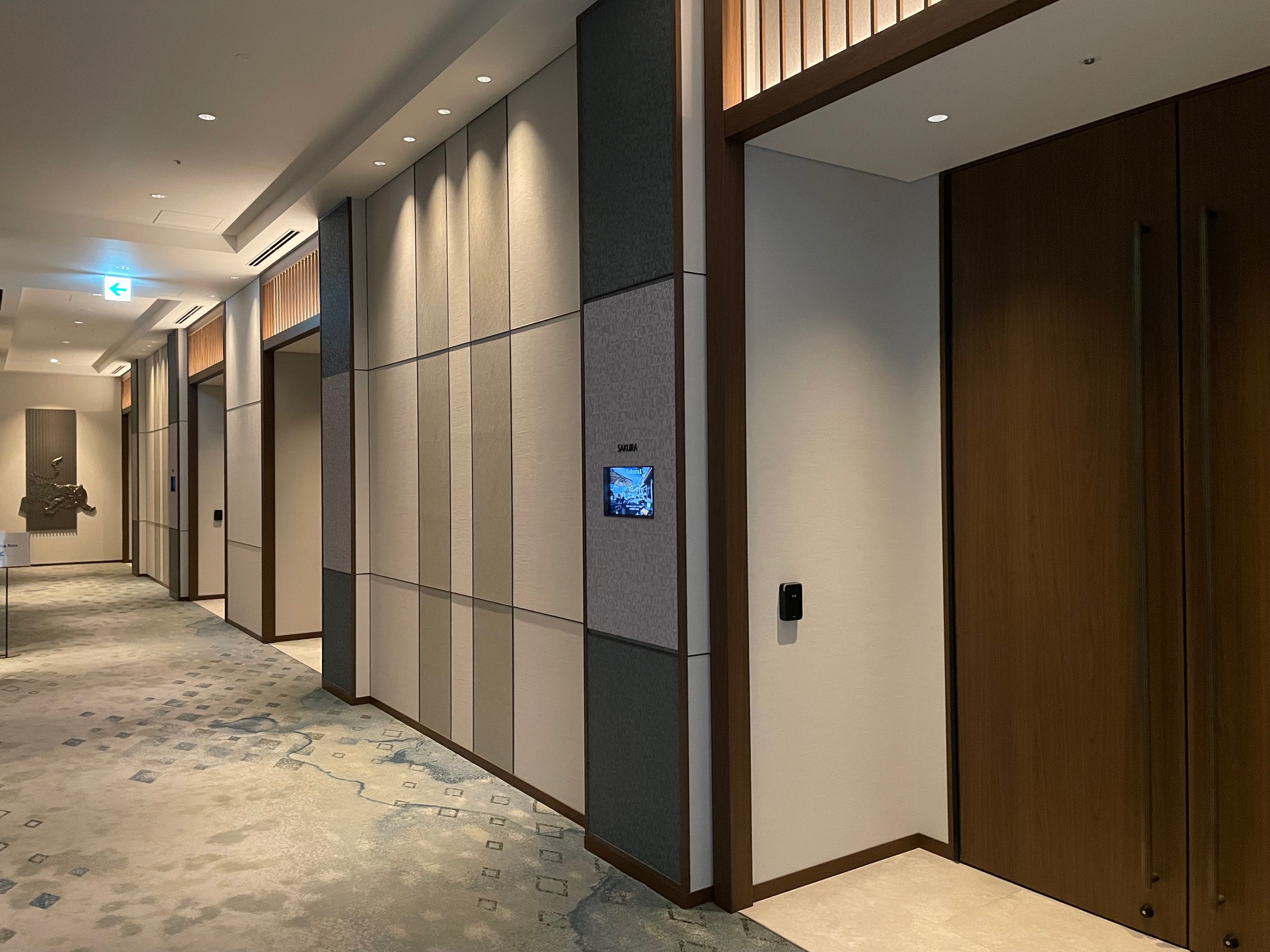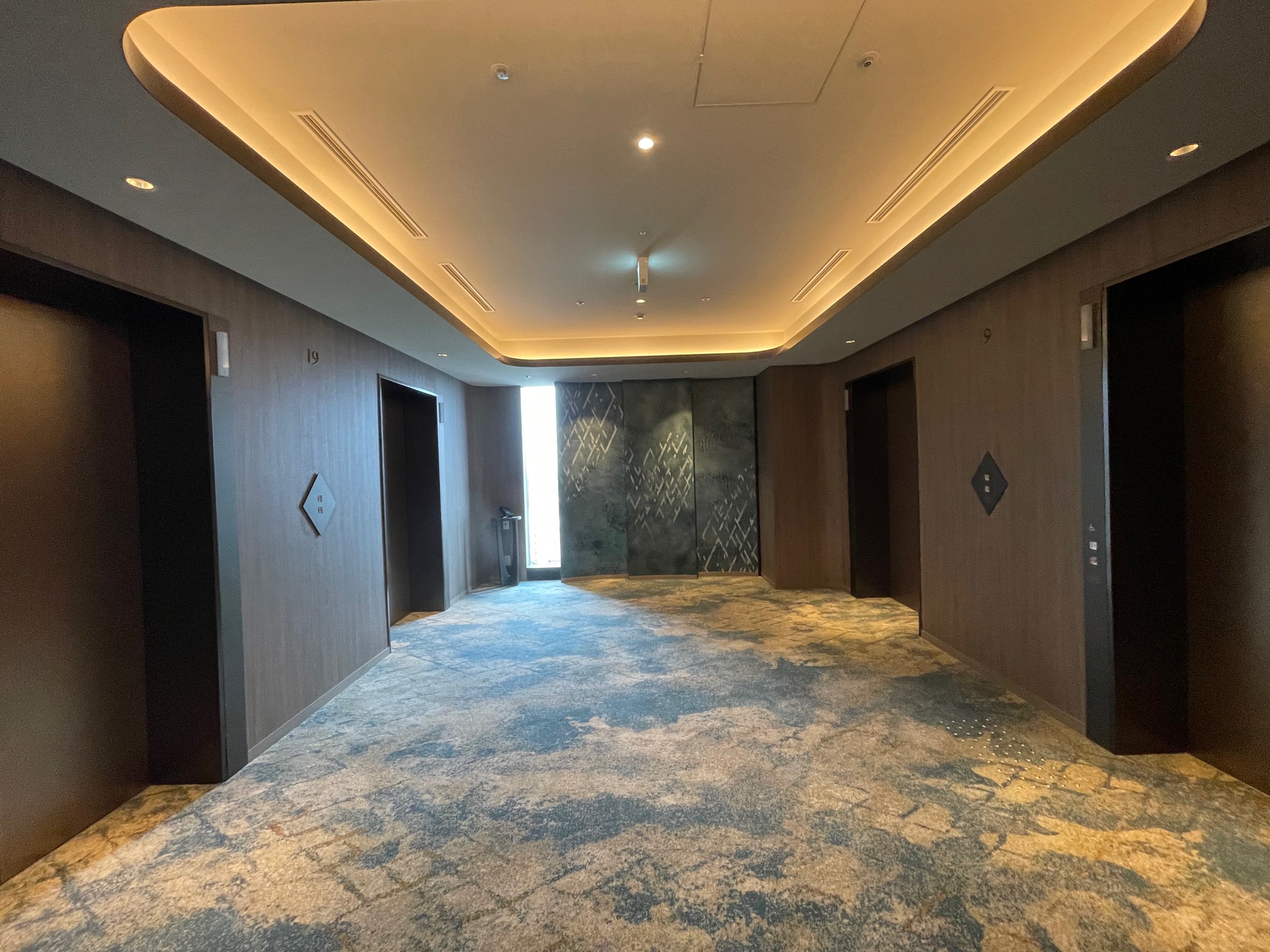 エレベーターホールはこんな感じです。「水の都」をイメージしているようで水をテーマに青色が多く取り入れています