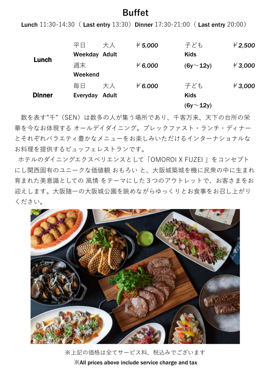 レストラン「オールデイダイニング」は、朝・昼・夜とバラエティ豊かなメニューをお楽しみいただけるビュッフェレストランです。レストラン内は一面ガラス張りの大阪城の景色がパノラマビューでお食事とともにお楽しみいただけます。同フロアに隣接した「ラウンジ&バー」では日中にはサラダやパスタなどのアラカルトのお食事やアフタヌーンティー、スイーツやコーヒーを、イブニングタイムにはシグネチャーカクテルやクラフトビールをご用意しております。