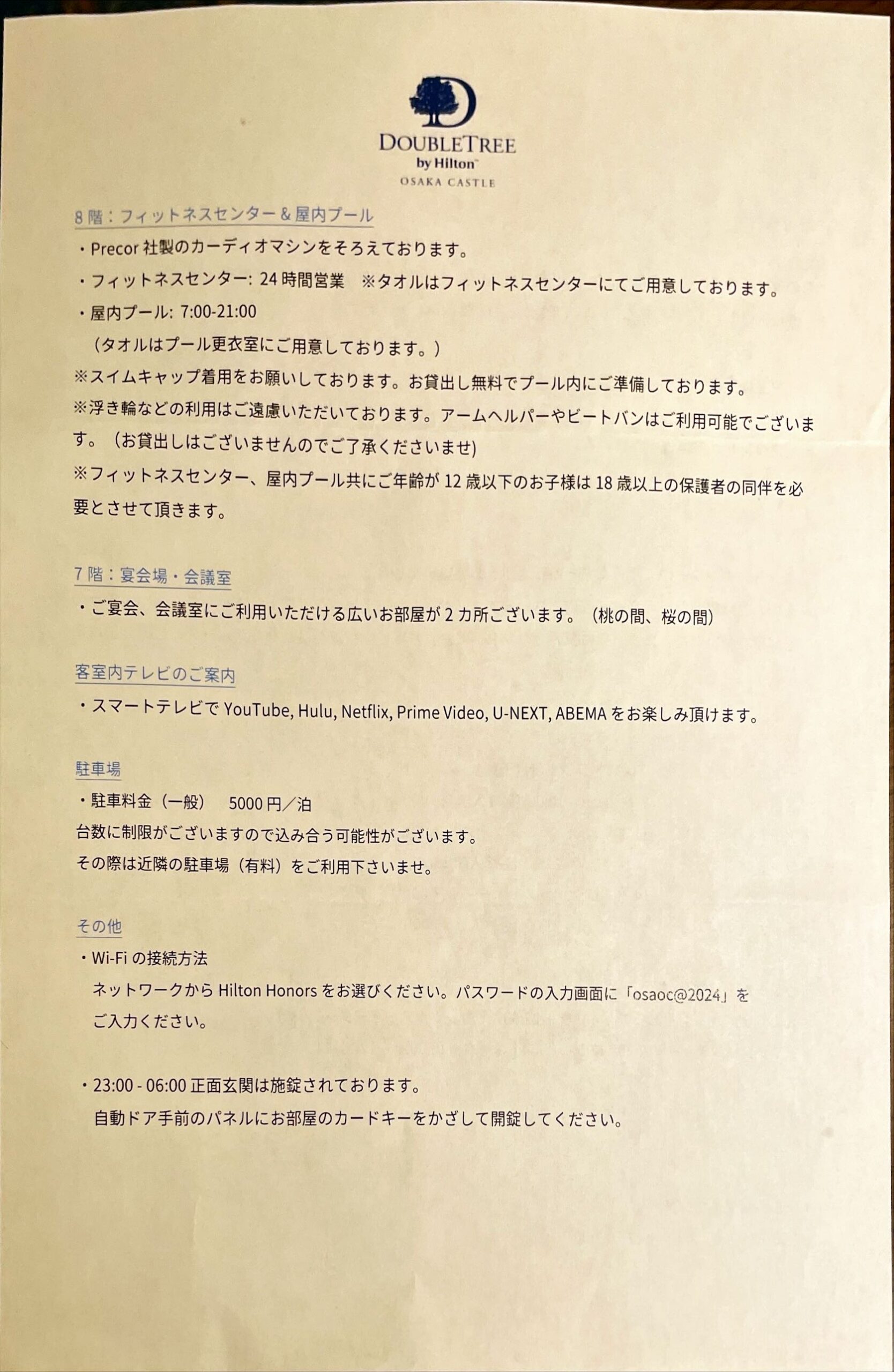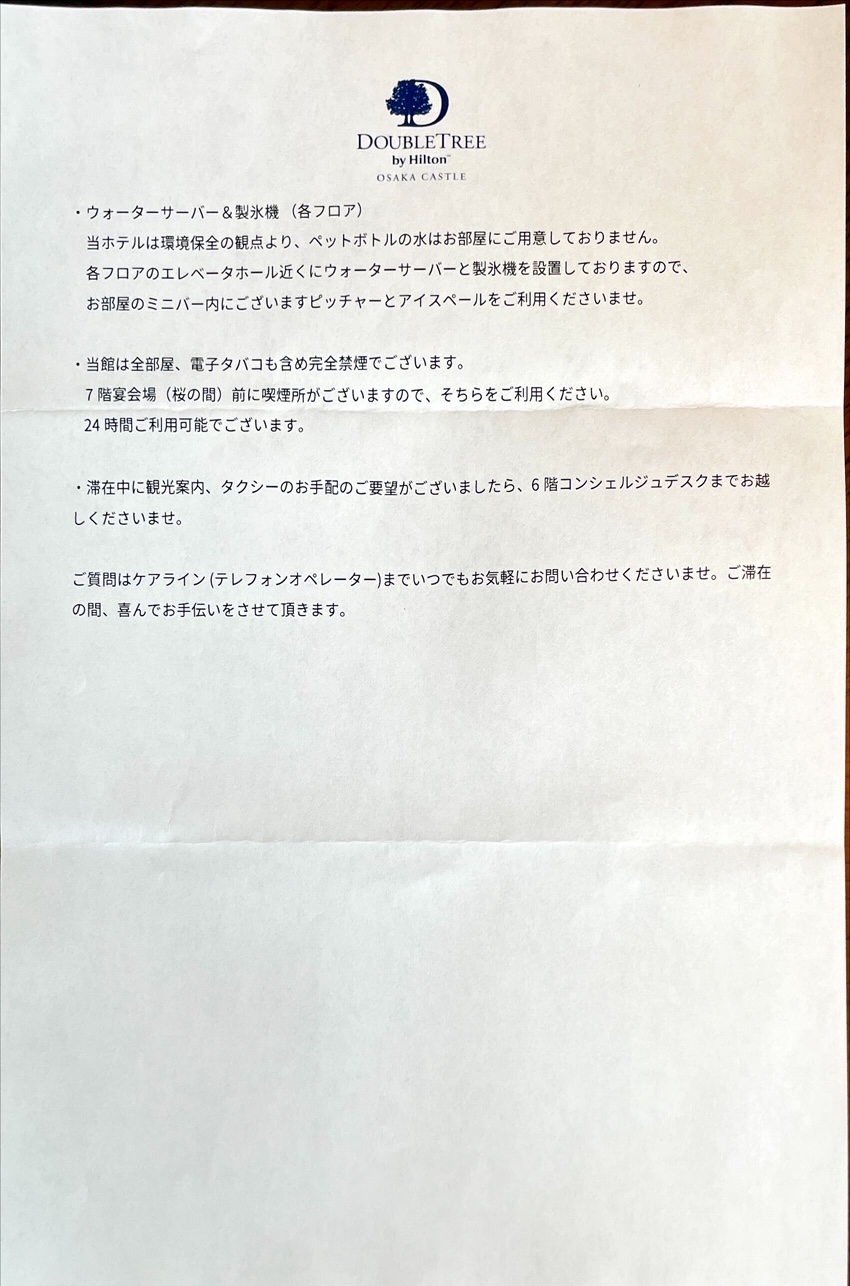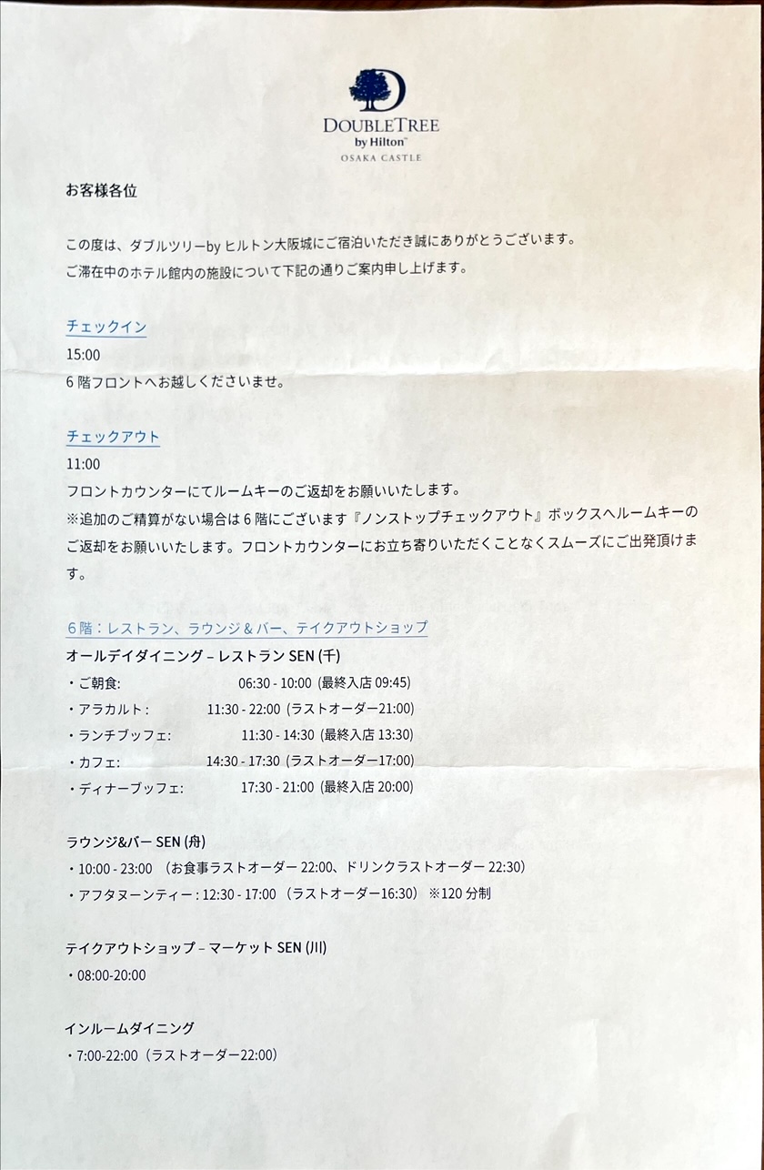 最後にダブルツリーbyヒルトン大阪城でチェックイン時に渡されるホテル案内をご紹介します