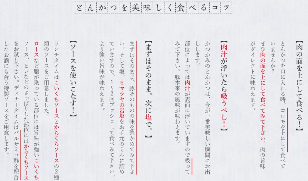 テーブルの上には「トンセツ」なるトンカツを楽しむための取説が置かれています。