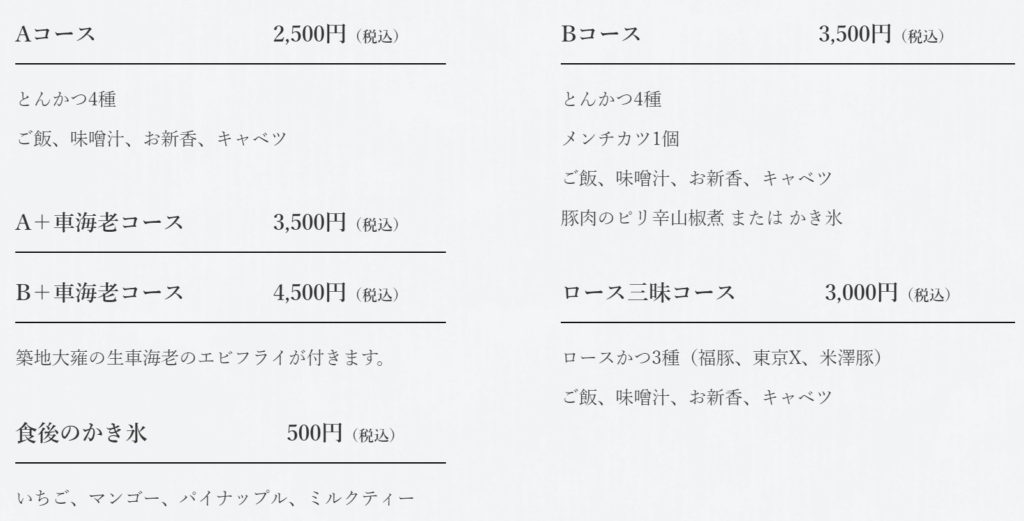福豚・東京X・米澤豚のロースかつを食べ比べできます。