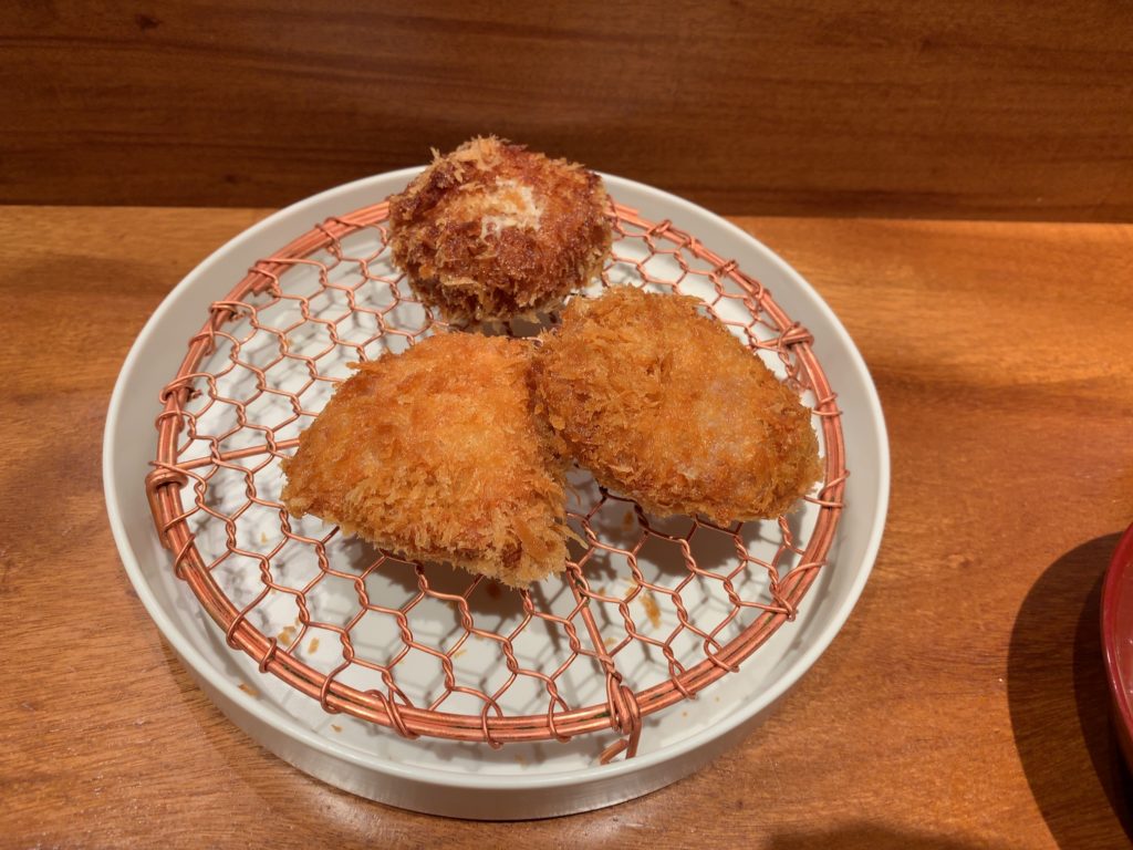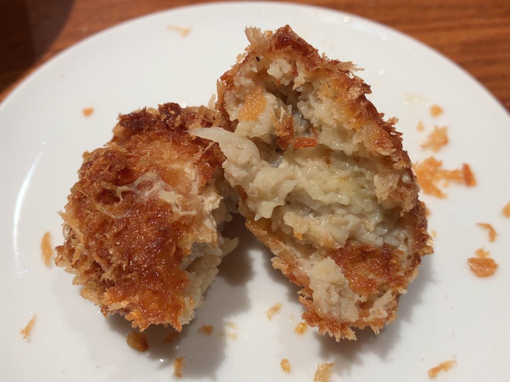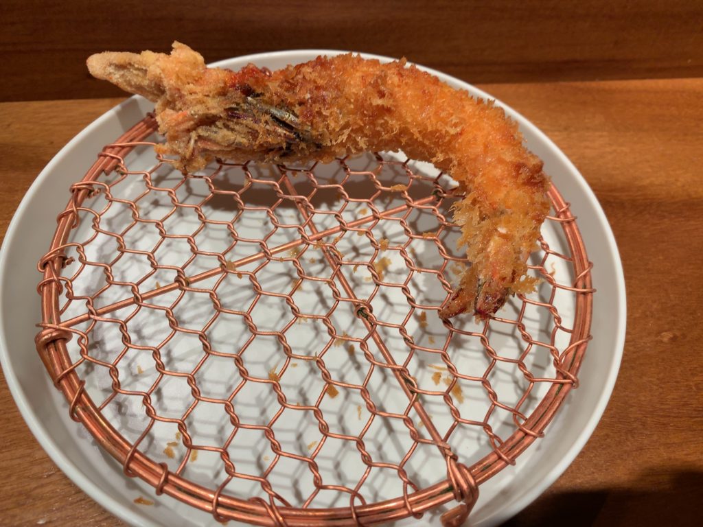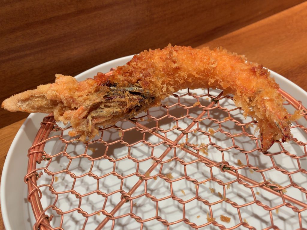 頭の部分は二度揚げしたからか揚がりすぎで硬かったですが、味噌の部分を食べられるエビフライは僕にとっては珍しく面白いなと思いました。身は締まっていてぎゅっと旨みが詰まっており美味しいです。しっぽにはレモンをかけて食べるように言われます。