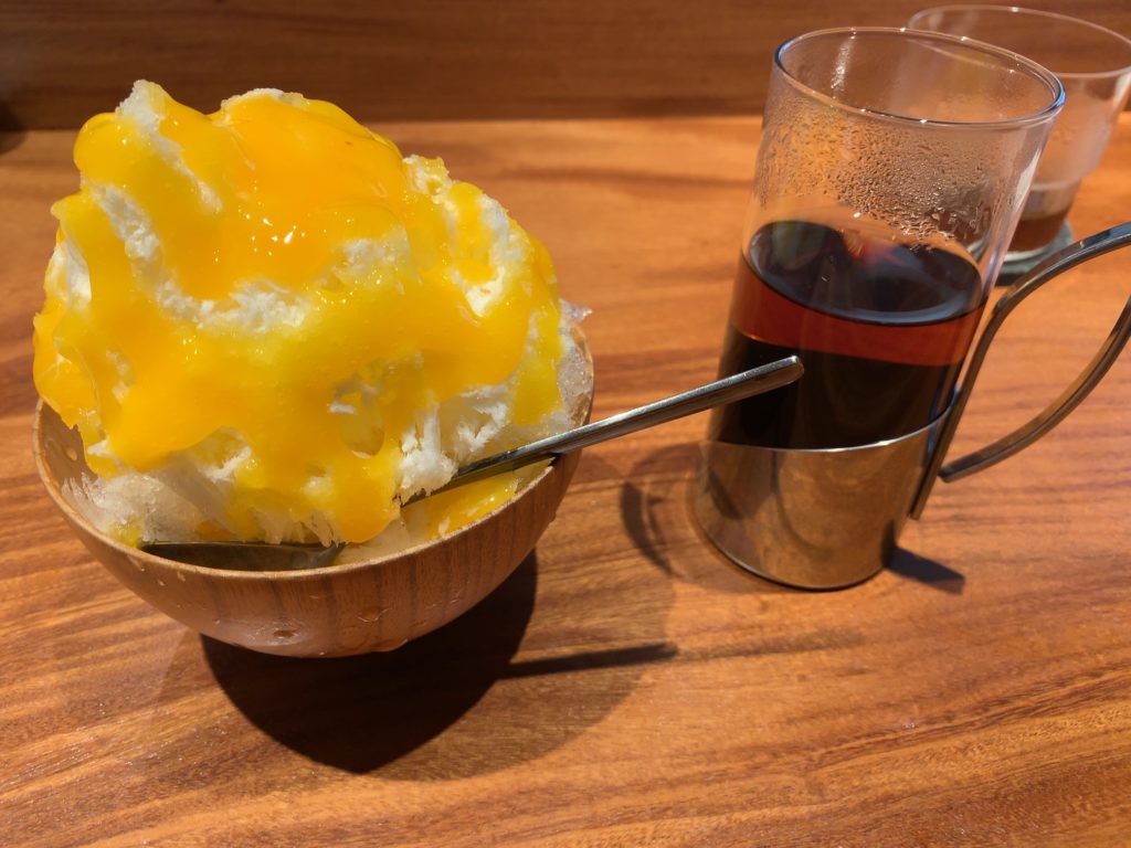 Aコースにメンチカツ、豚肉のピリ辛山椒煮またはかき氷がつきます