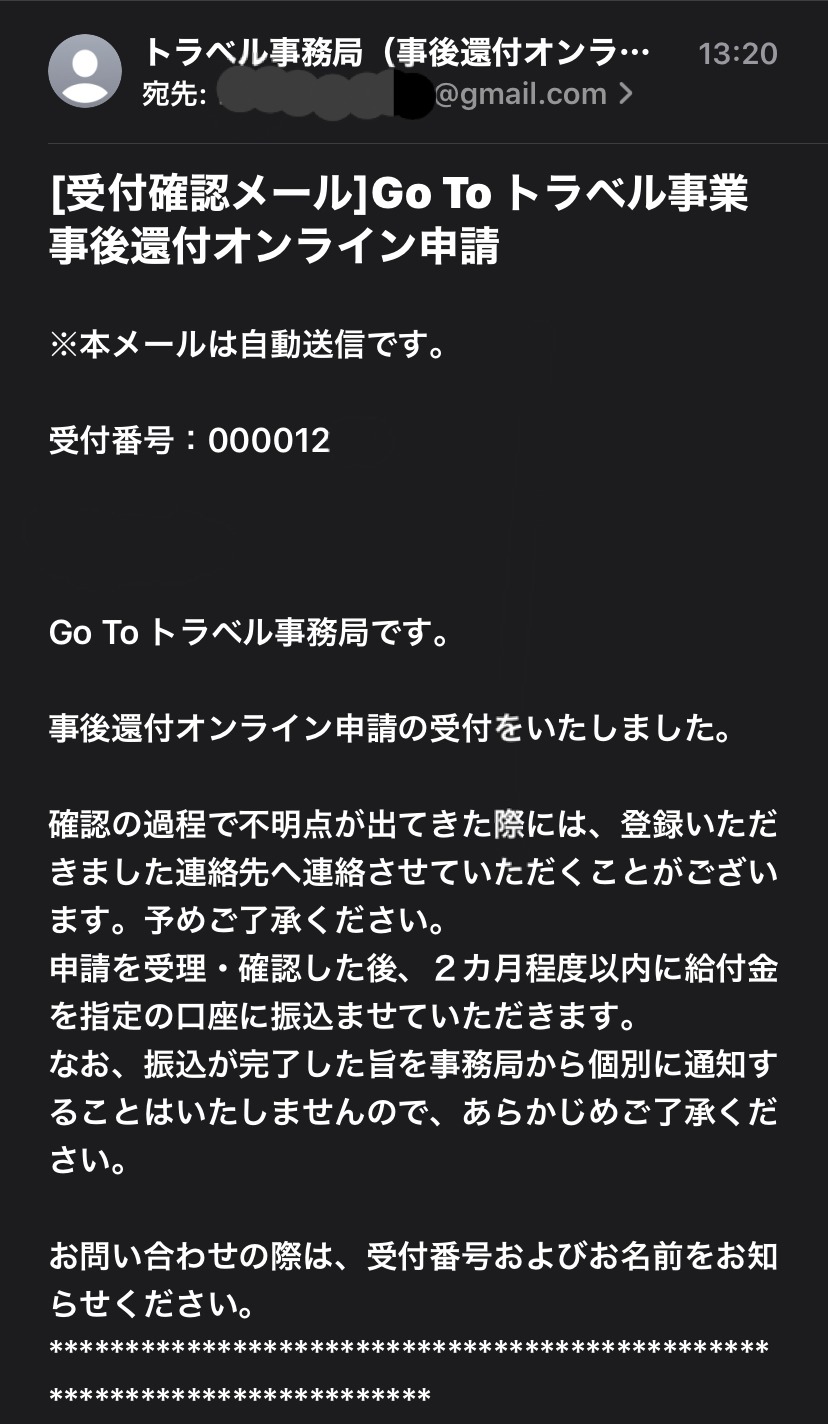 書類の画像などが1枚しか添付できないなど使い勝手に問題はありますが、3施設までまとめて申請できますし、手続きも簡単ですのでオンライン申請をお勧めします。オンラインでの申請の場合、「支払いがわかる書類」「宿泊証明書」「口座番号が確認できる書類」「住所が確認できる書類」「同行者居住地証明書」をpdf、gif、jpg、pngファイルでアップロードする必要があります。申請が完了すればとりあえず申請完了メールが来るので安心ではあります。