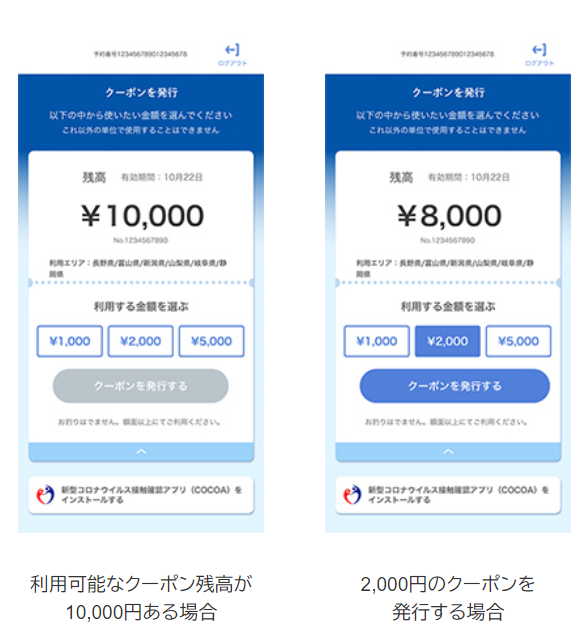 電子クーポンは1,000円・2,000円・5,000円の3種類ありますので、発行するクーポンの金額を選択します。後述するようにおつりは出ませんので発行するクーポンの金額は十分に考えた上で発行しましょう!