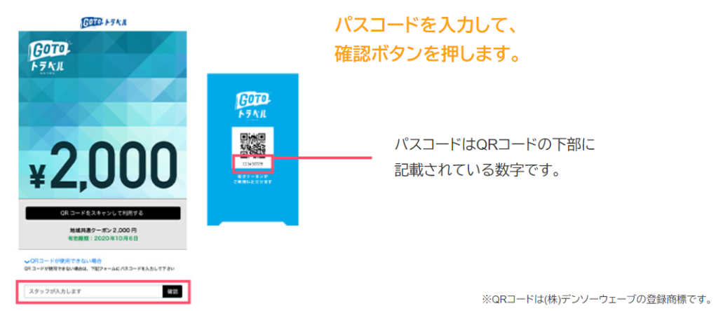 QRコードを読み込めない場合は、パスコード(QRコード下部に記載の数字)を旅行者自身が入力する必要があります。
