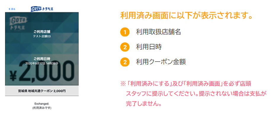 「利用済みにする」及び「利用済み画面」を必ず店頭スタッフに提示してください。提示されない場合は支払が完了しません。