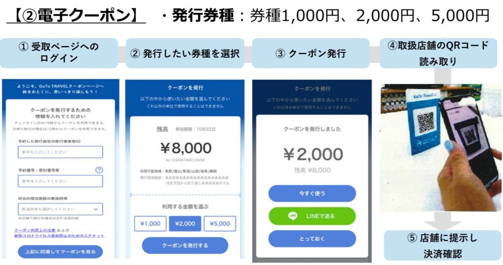 地域共通クーポンは旅行業者または宿泊事業者より配布されるわけですが、旅行業者・宿泊業者により紙クーポンで配布されるのか電子クーポンで配布されるのかが異なります。