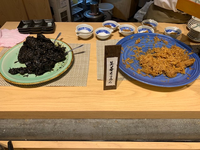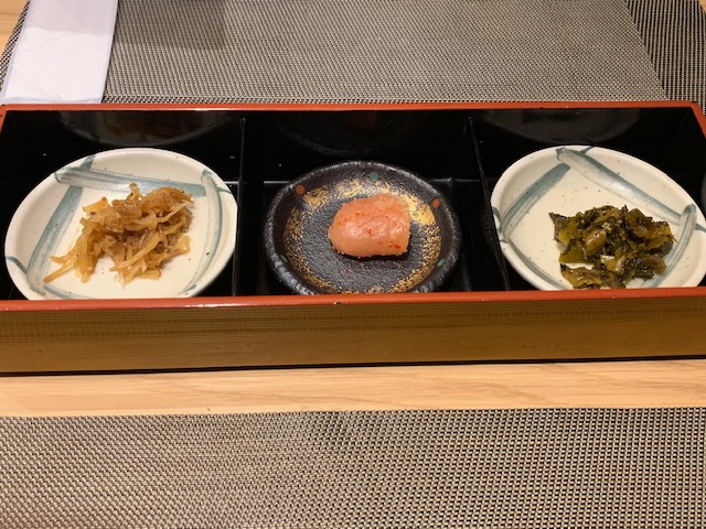 最初に店員さんが「ごはんのお供(友?)」のメニューから3種をテーブルに持ってきてくれます。