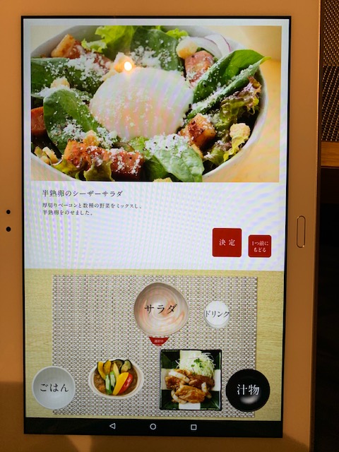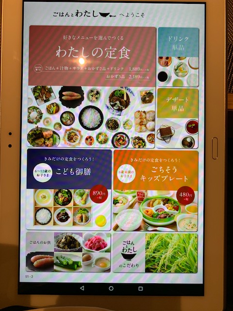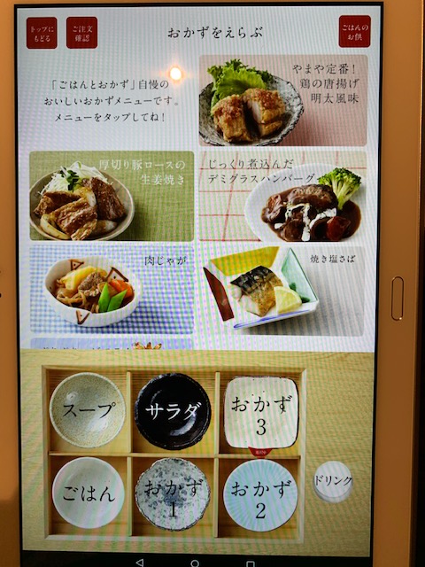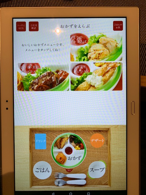 メニューを選んでいくと画面下部の決定済みの器の中に選択したメニューの写真が入るのがゲーム感覚で子供も楽しんでいました。隣の男子小学生の集団はタブレットが来るまでゲームに熱中していたのに、タブレットが来るとゲームを放り出してみんな黙って注文していたのが印象的でした(笑)