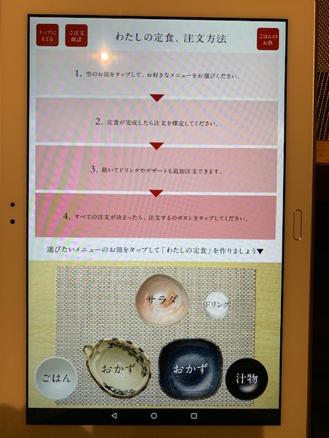 入店すると店員さんがタブレットを持ってきます。注文方法は直感的で、説明がなくても簡単です。画面下の空の器をタッチすると、その器の中に入るメニューが画面上側に表示され、好きなものを選択し、また空の器をタッチして…という作業を繰り返し、全ての器を埋めるだけです!