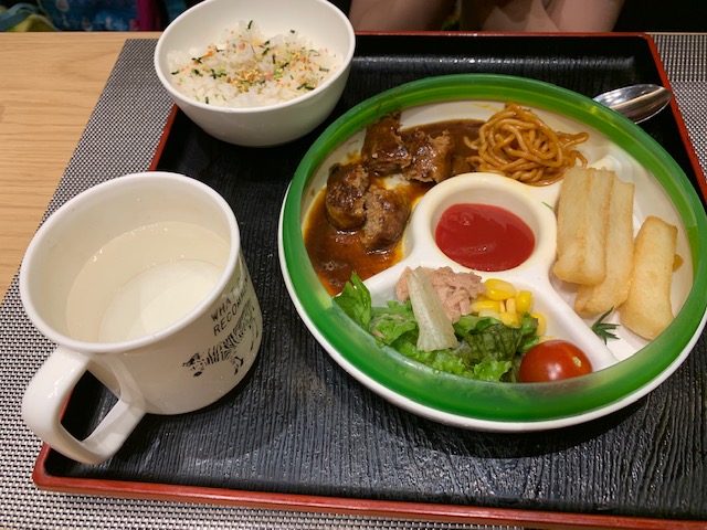 こども御膳はおかず1品(パスタ、ポテト、サラダは共通でついています)+スープ+ごはん+ドリンク+デザートのセットとなっており890円(税込み961円)となっています