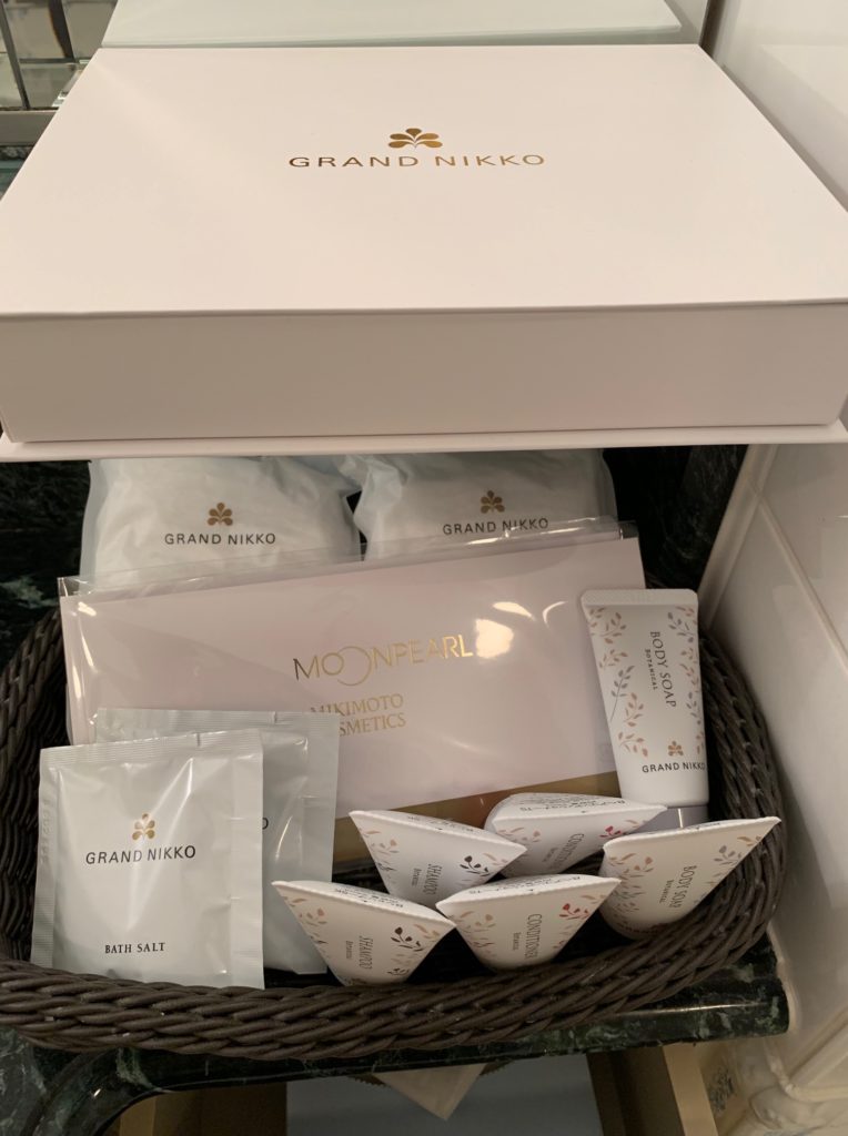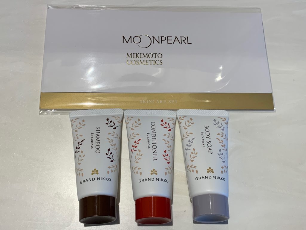 オリジナルのシャンプー、コンディショナー、ボディソープにミキモトのスキンケアセットでした。