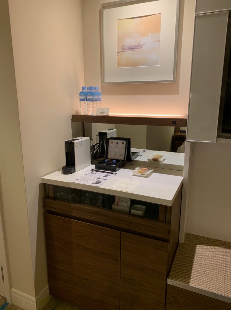 ネスプレッソや電気ケトル、サービスのミネラルウォーターやスイーツなどが冷蔵庫上に並べられています。