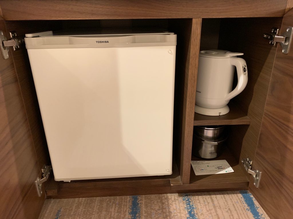 キャビネットを開けると電気ケトルと冷蔵庫があります