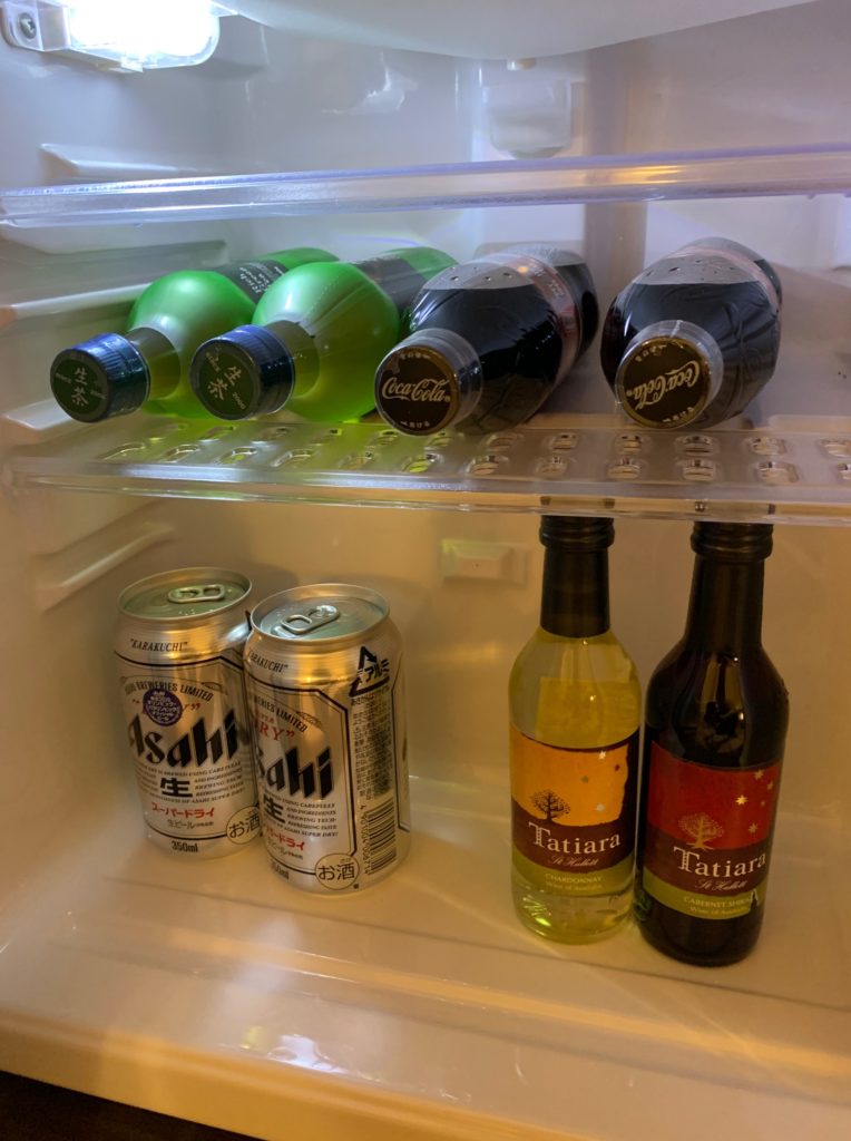 客室内の冷蔵庫にはコーラ、生茶、缶ビール(スーパードライ)、ワイン(赤白1本ずつ)が2本ずつ用意されていました。