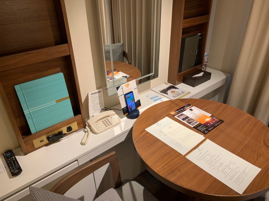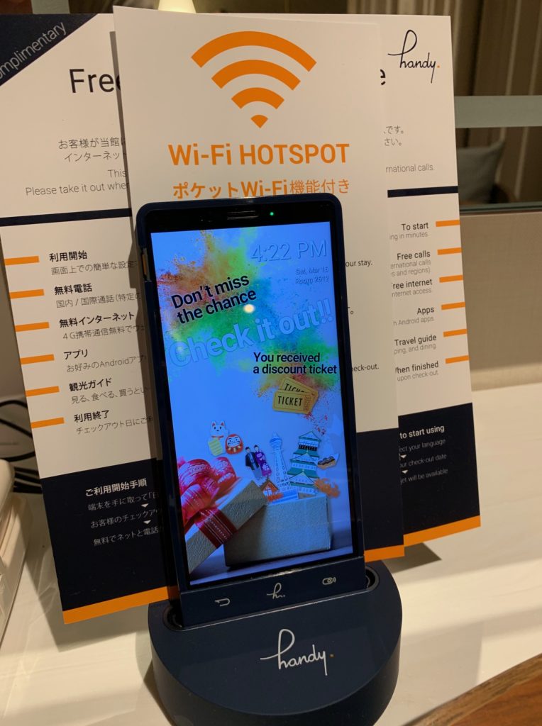 最近よく見かける宿泊中に使用できるスマホhandyが置いてありました。