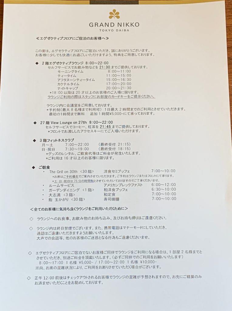 アメックスフリーステイギフトを使ってアップグレードプランでホテルグランドニッコー東京台場に宿泊した様子をご紹介します。15000円~の追加料金でエグゼクティブフロアにアップグレード、朝食無料、ラウンジアクセスあり、フィットネスクラブ利用無料、駐車場無料とお得なプランだと思います。