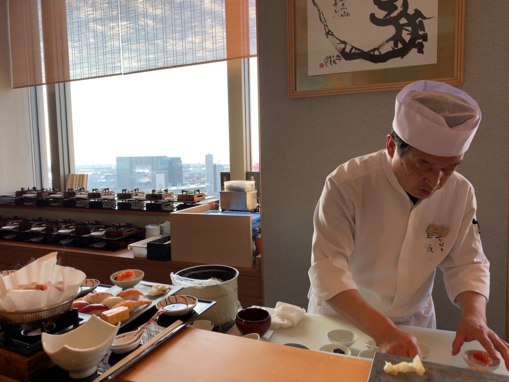 30階だけあって景色もいいです!カウンターに案内されお寿司がどんどん握られていく様子を見ながら待ちます